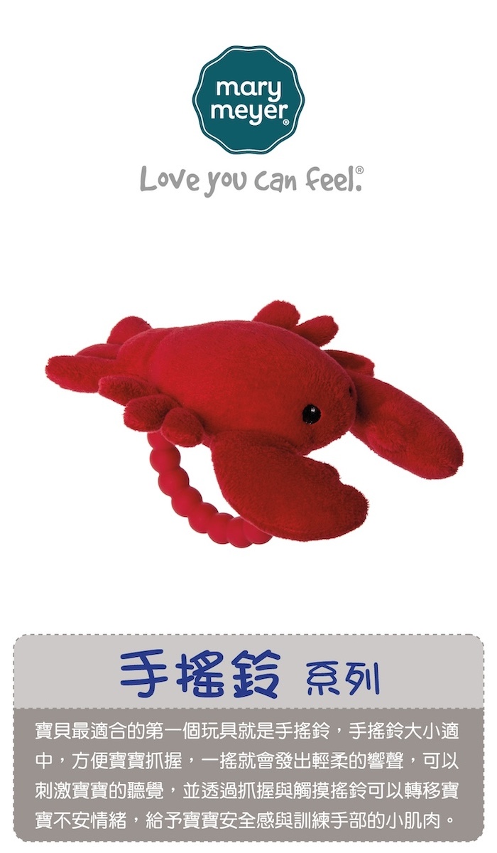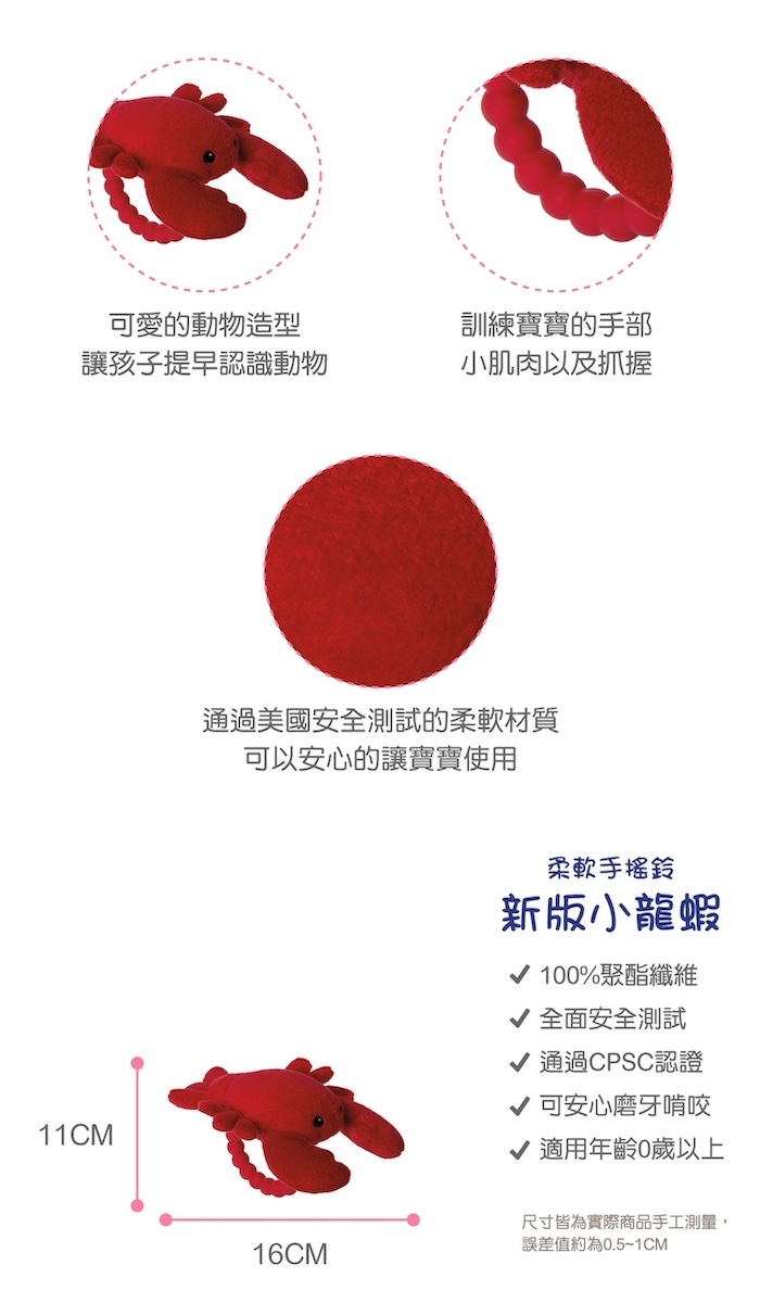 ●在海底最顯眼的小龍蝦,其實他只是因為害羞而全身紅通通,最喜歡比YA跟小朋友一起拍照喔!●完美適合小手的尺寸易抓握,讓寶寶輕鬆訓練小手的肌肉。●安全柔軟布料,纖細柔軟不傷害寶寶柔嫩肌膚。●矽膠材質的手把可當固齒器,讓寶寶口慾期不亂放東西在嘴巴,也可舒緩口腔不適。●搖鈴聲響吸引寶寶注意,可刺激聽覺,亦適合寶寶手指動作練習。
