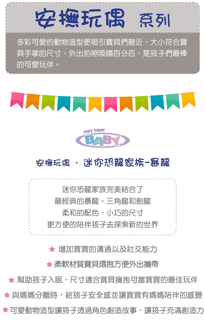 ●迷你恐龍家族完美結合了最經典的暴龍、三角龍和劍龍以及柔和的配色。每一隻都設計小尺寸讓小手剛好可以抓握。●毛絨又柔軟的玩偶陪伴寶寶,給予安全感。●活潑鮮豔吸引寶寶的配色、刺繡的五官細節。●安全柔軟布料適合訓練寶寶抓握。●纖細柔軟不傷害寶寶柔嫩肌膚。●刺激發育,有效的安撫寶寶。"