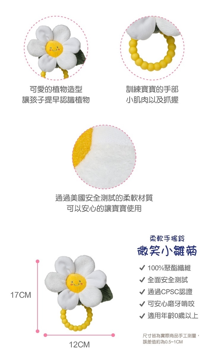 ●清新亮麗的微笑小雛菊,如同暖陽又天真充滿希望,用笑容療癒身邊每一個人。●觸感柔軟且帶給寶寶安全感,陪伴寶寶讓他勇敢自行入睡●寶貝最愛打結的角落●矽膠材質的手把可當固齒器,讓寶寶口慾期不亂放東西在嘴巴,也可舒緩口腔不適●完美適合小手的尺寸易抓握,讓寶寶輕鬆訓練小手的肌肉●纖細柔軟不傷害寶寶柔嫩肌膚●不同的布料刺激觸覺,有效的安撫寶寶