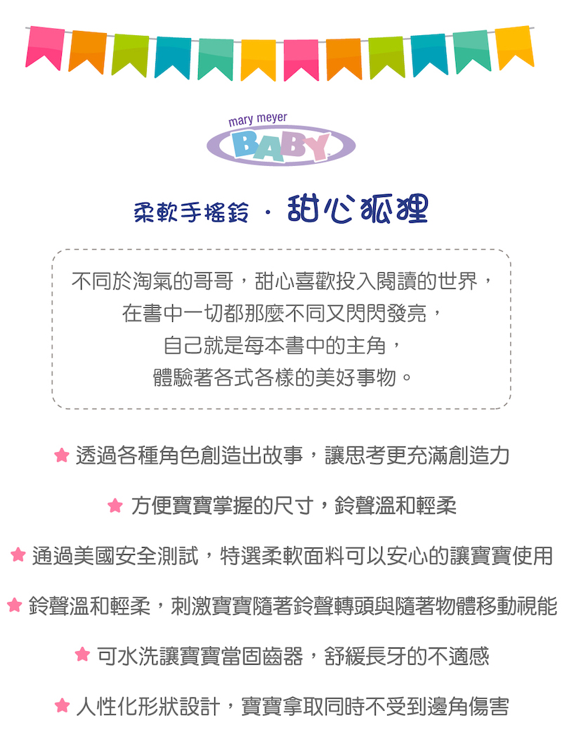 ●不同於淘氣的哥哥,甜心喜歡投入閱讀的世界,在書中一切都那麼不同又閃閃發亮,自己就是每本書中的主角,體驗著各式各樣的美好事物。●甜美又時髦的甜心狐狸,帶著溫柔與耐心陪伴孩子成長。●優雅配色、精緻的細節。●安全柔軟布料適合孩子抓握。●纖細柔軟不傷害寶寶柔嫩肌膚。●不同的布料刺激觸覺,有效的安撫寶寶。