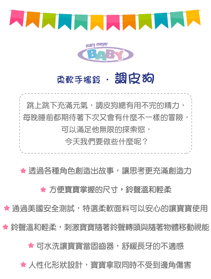 ●跳上跳下充滿元氣,調皮狗總有用不完的精力,每晚睡前都期待著下次又會有什麼不一樣的冒險,可以滿足他無限的探索慾,今天我們要做些什麼呢?●最受孩子喜愛的調皮狗,中性顏色配色,燦爛的笑容,帶來一整天的好心情。●優雅配色、精緻的細節。●安全柔軟布料適合孩子抓握。●纖細柔軟不傷害寶寶柔嫩肌膚。●不同的布料刺激觸覺,有效的安撫寶寶。
