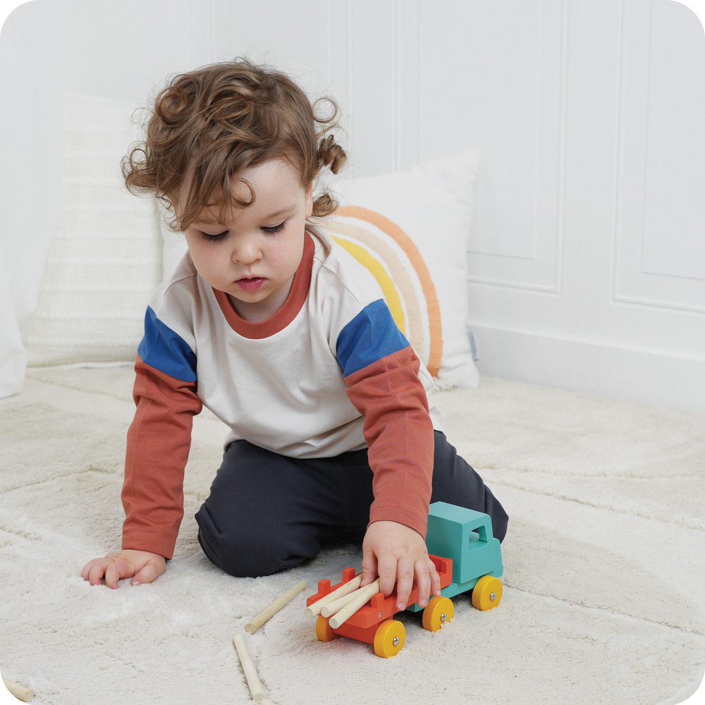精典復古的運輸車系列,讓孩子沉浸在車車的世界裡面。珊瑚橘與湖水綠配色的森林木材運輸車,將載著木材運送到目的地。用手來回推動和裝載貨物,訓練孩子的手部肌肉和操控能力。