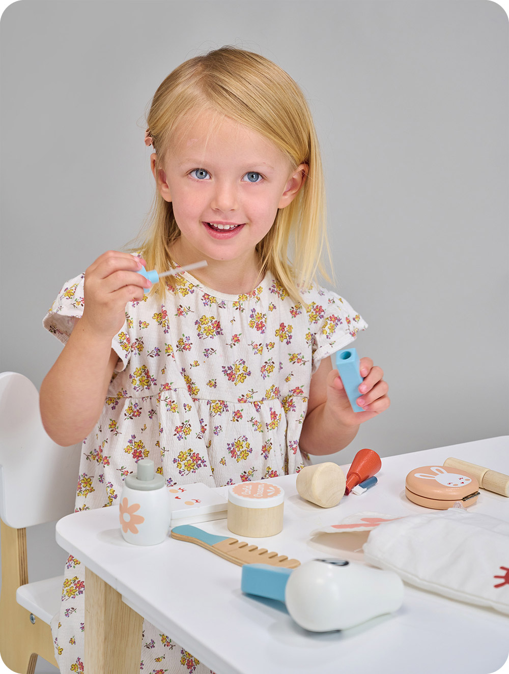 愛漂亮的小女生和小男生最喜歡的彩妝組遊戲,不僅可以妝扮自己,也可以改造娃娃。小兔彩妝組內含口紅、指甲油、乳霜、梳子、吹風機、睫毛膏、眼影盤、香水和粉撲,全部收納在可愛的小兔抽繩束口袋。讓小孩可以隨心所欲的點亮自己,提升自信心和美感素養。