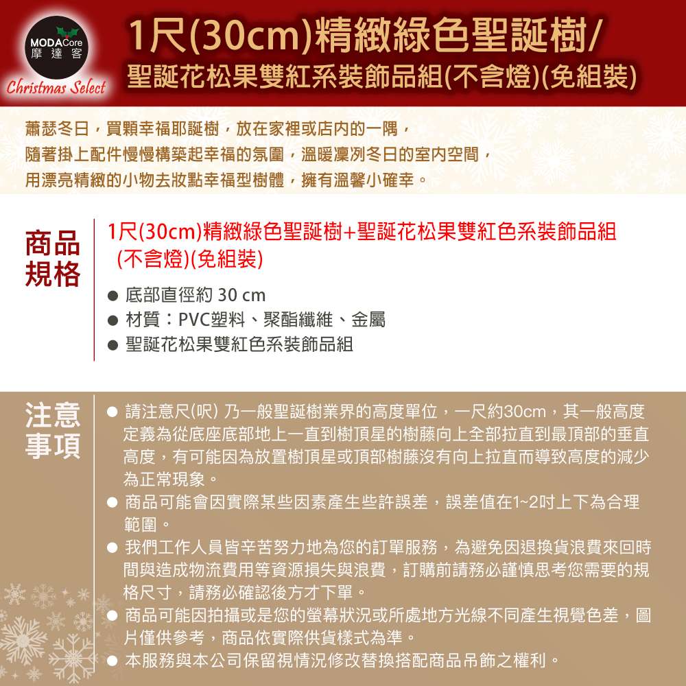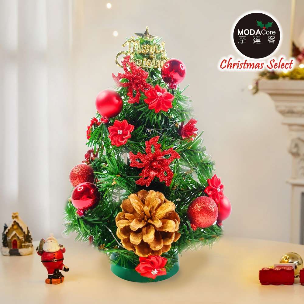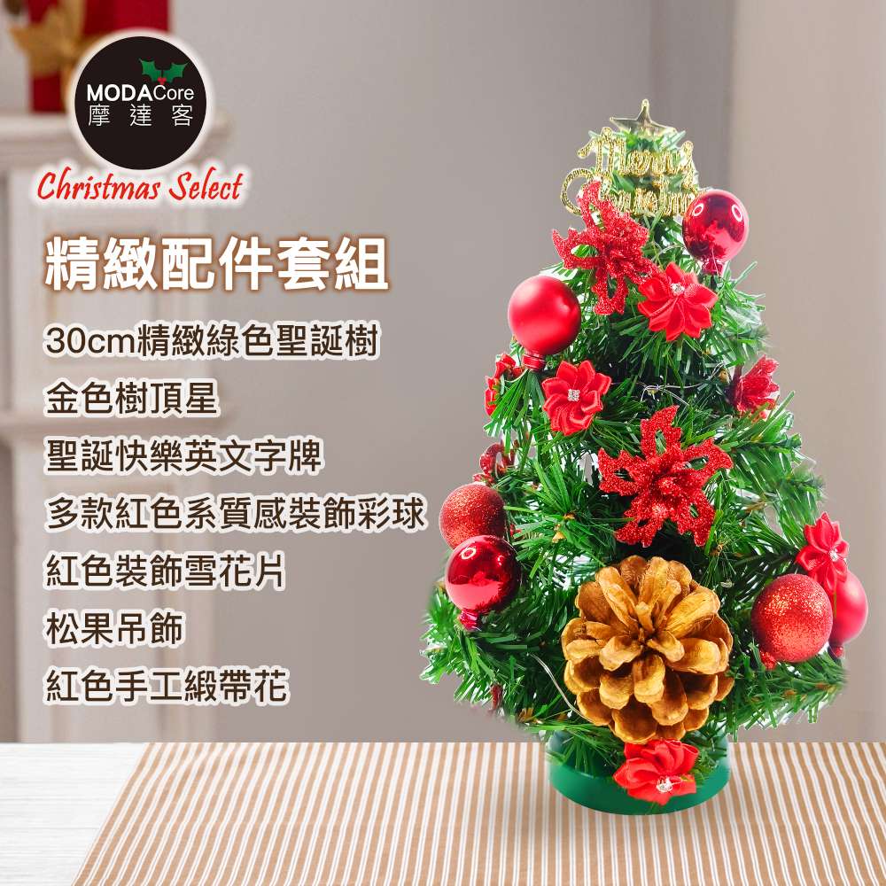 摩達客-台灣製1尺30cm精緻綠色聖誕樹+聖誕花松果雙紅系裝飾品組_免組裝_本島免運費