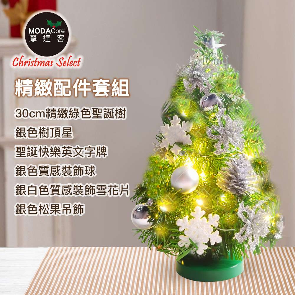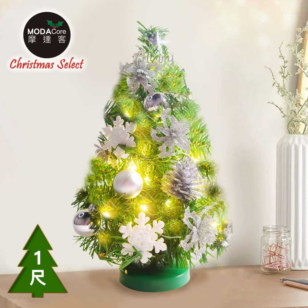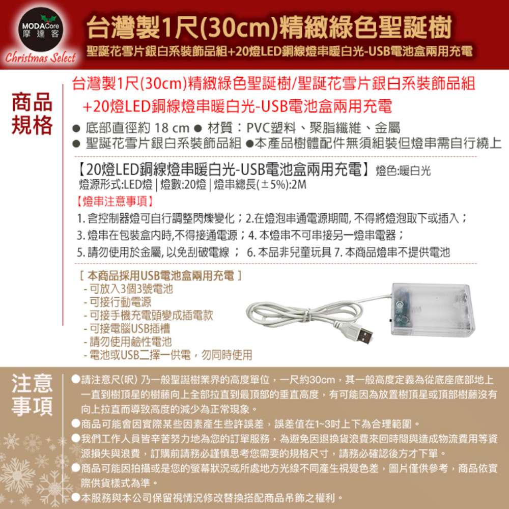 摩達客-台灣製1尺30cm精緻綠色聖誕+聖誕花雪片銀白系裝飾品組_免組裝+20燈LED銅線燈串暖白光-USB電池盒兩用_本島免運費