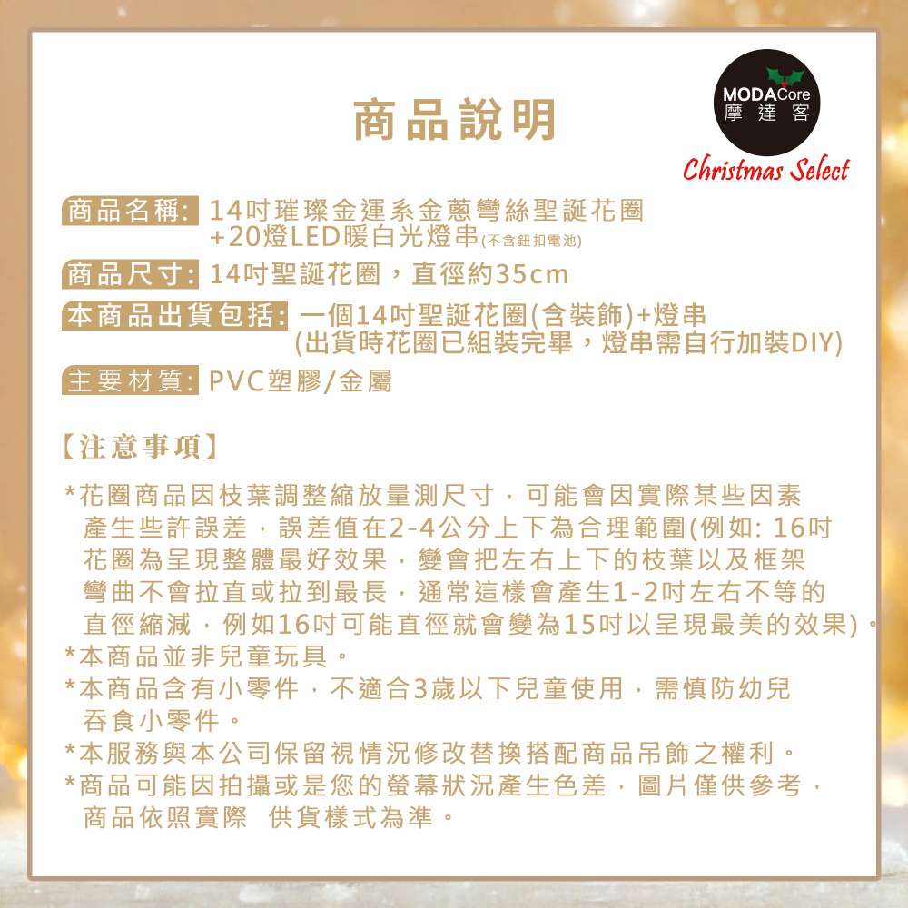 摩達客14吋璀璨金運系金蔥彎絲聖誕花圈+20燈LED暖白光燈串_本島免運費