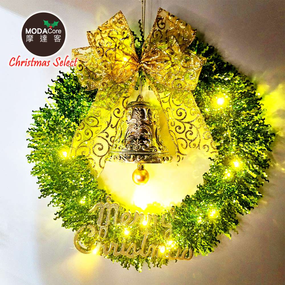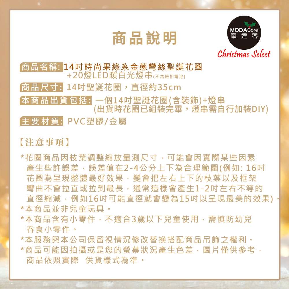 摩達客14吋時尚果綠系金蔥彎絲聖誕花圈+20燈LED暖白光燈串_本島免運費
