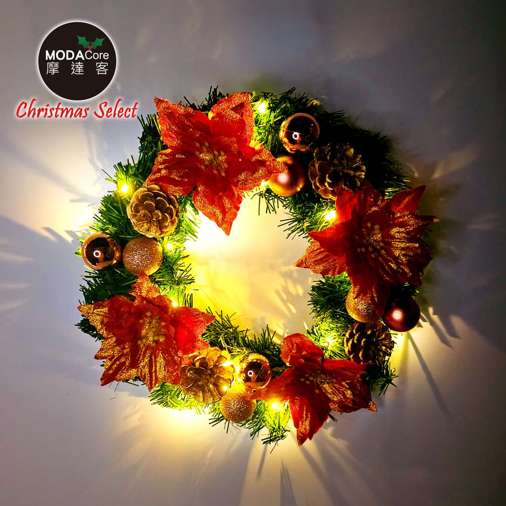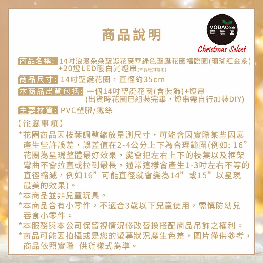 摩達客14吋浪漫朵朵聖誕花豪華綠色聖誕花圈福臨圈_珊瑚紅金系+20燈LED暖白光燈串_本島免運費