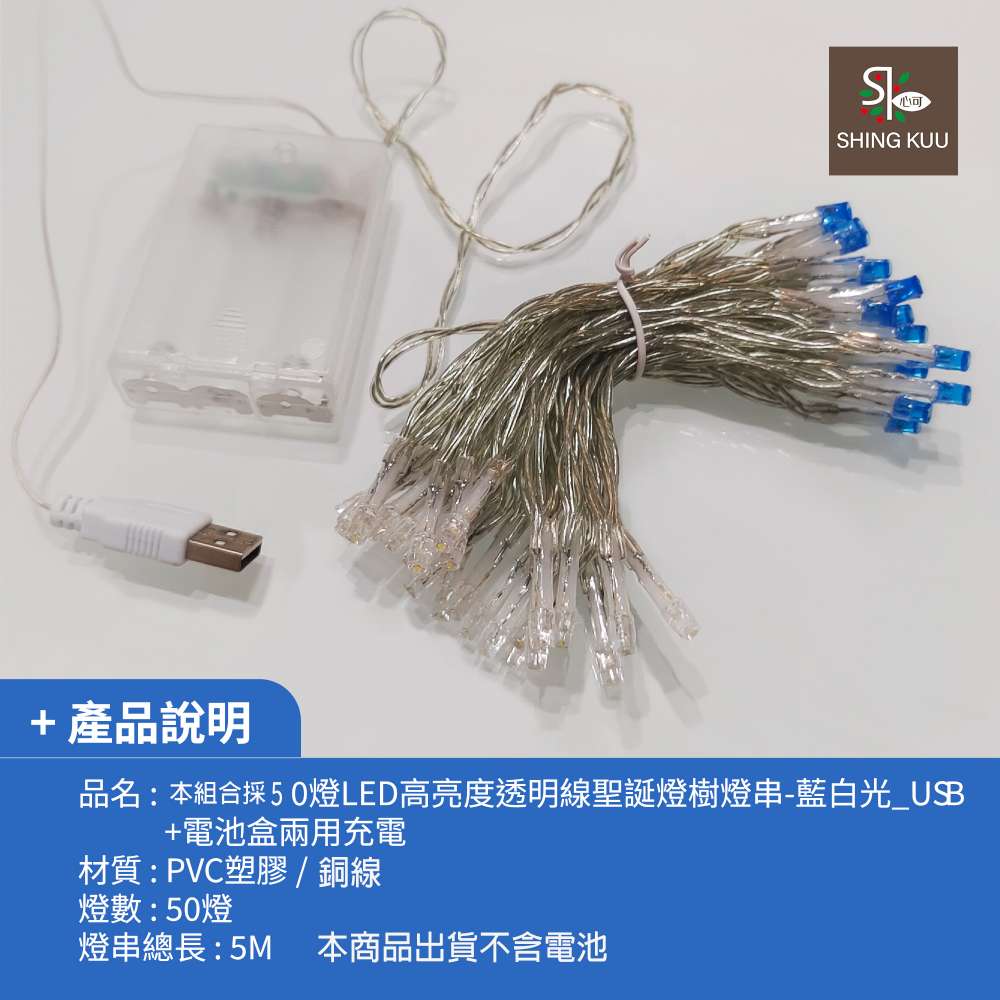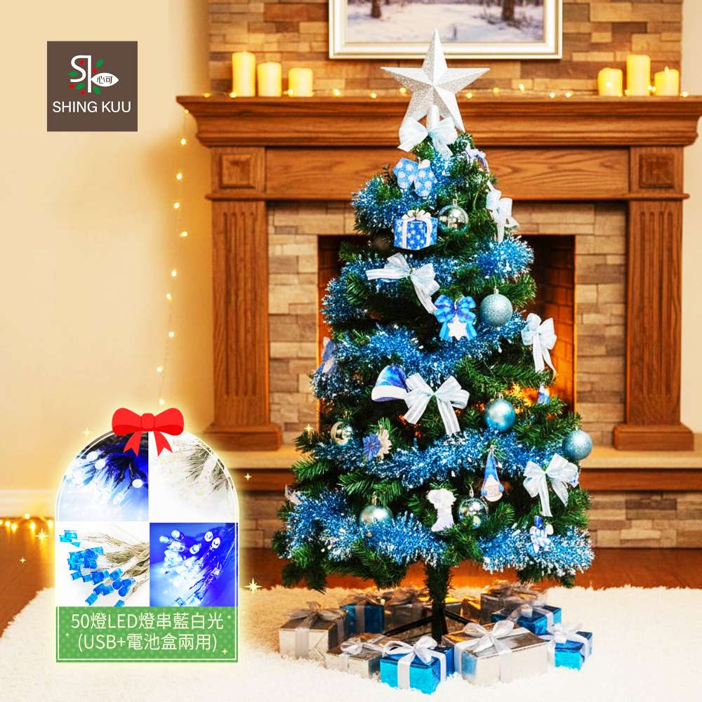 心可樂活-4尺120cm小美好套裝聖誕樹+藍銀系木質彩繪系飾品組+50燈LED燈串藍白光_USB電池盒兩用