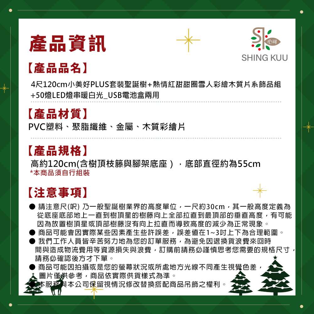 心可樂活-4尺120cm小美好PLUS套裝聖誕樹+熱情紅甜甜圈雪人彩繪木質片系飾品組+50燈LED燈串暖白光_USB電池盒兩用