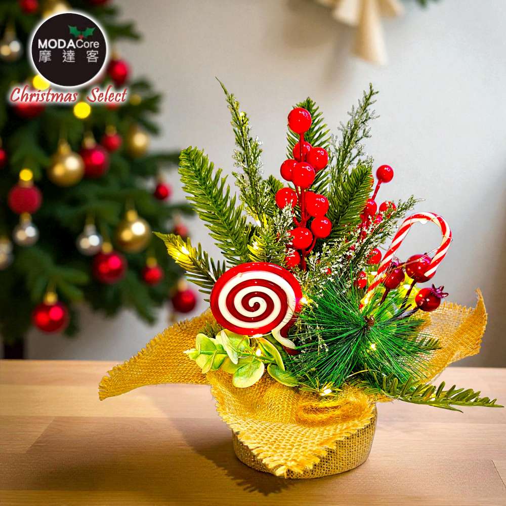 摩達客-25cm聖誕樹裝飾花盆擺飾-棒棒糖紅果款+20LED暖白光燈串-交換禮物耶誕派對推薦