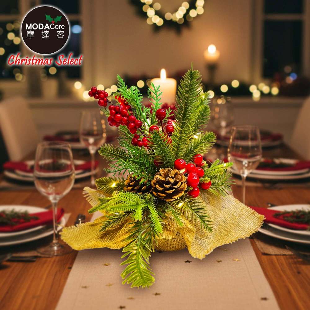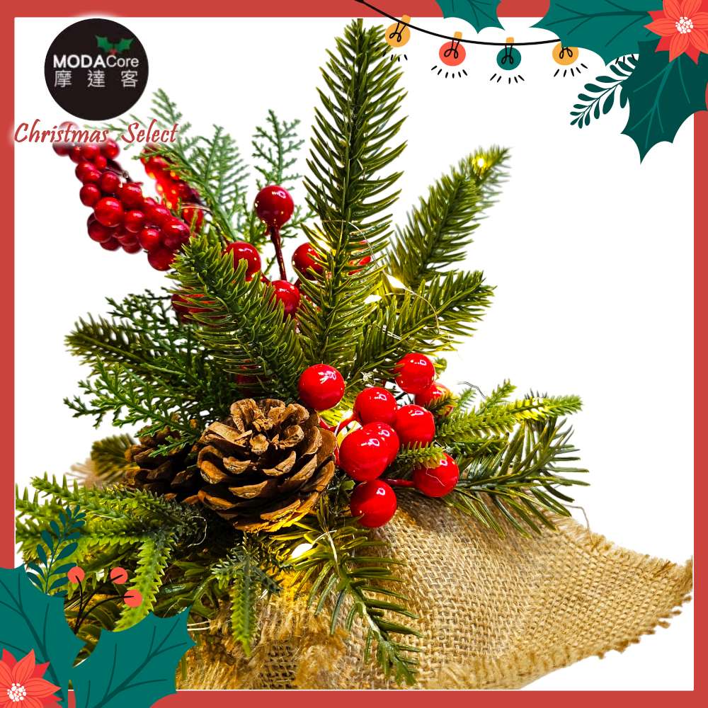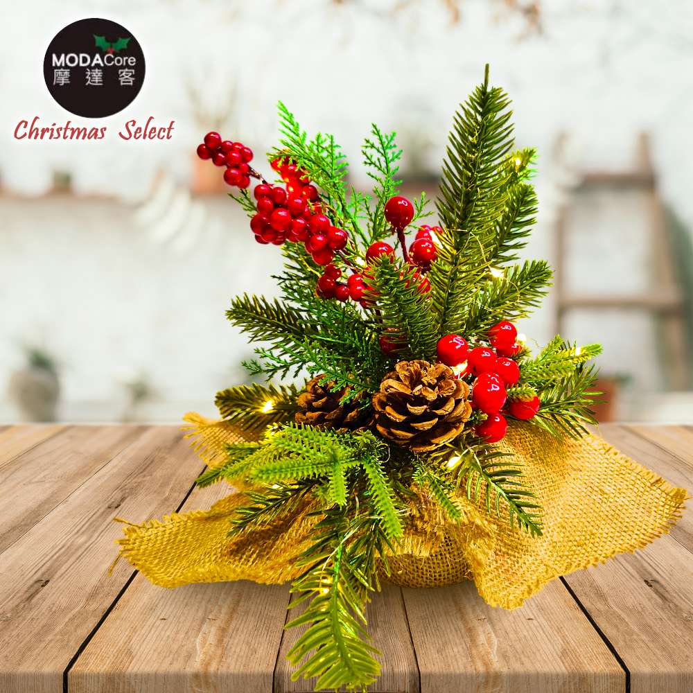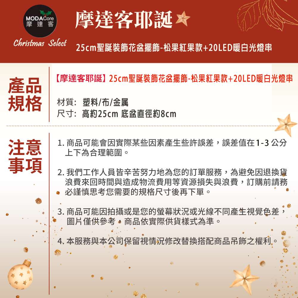摩達客-25cm聖誕裝飾花盆擺飾-松果紅果款+20LED暖白光燈串-交換禮物耶誕派對推薦