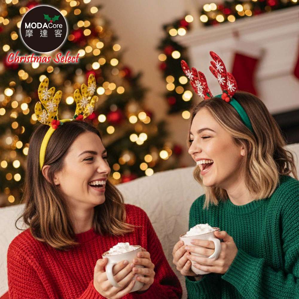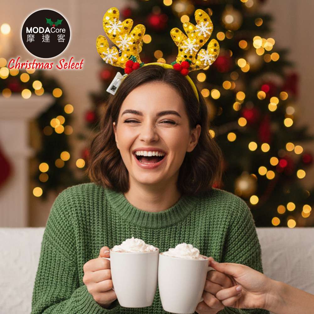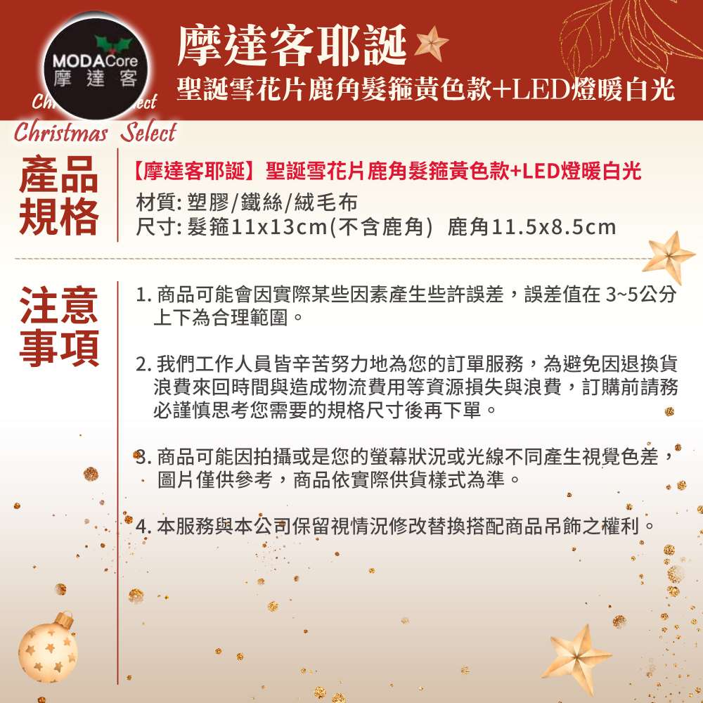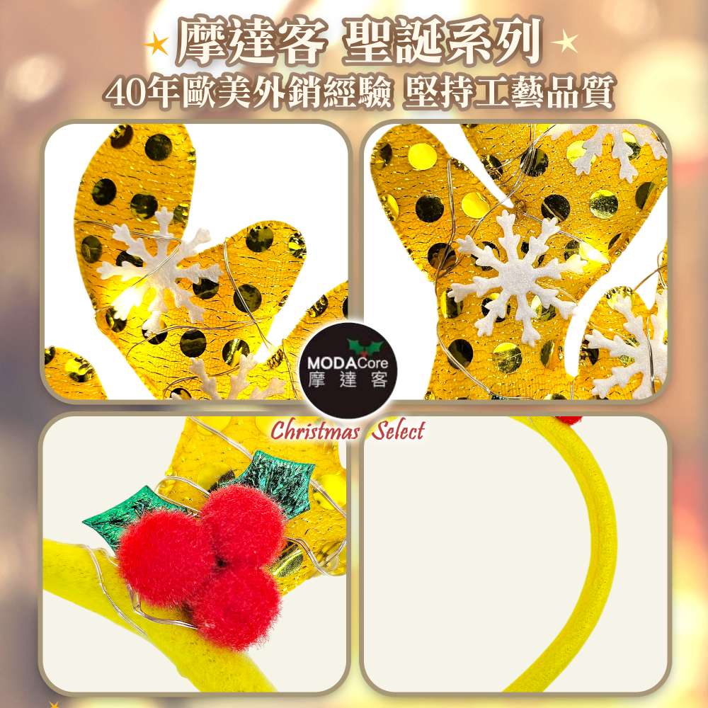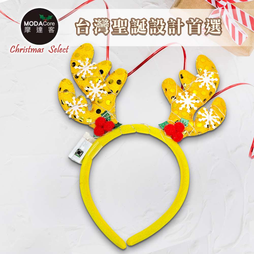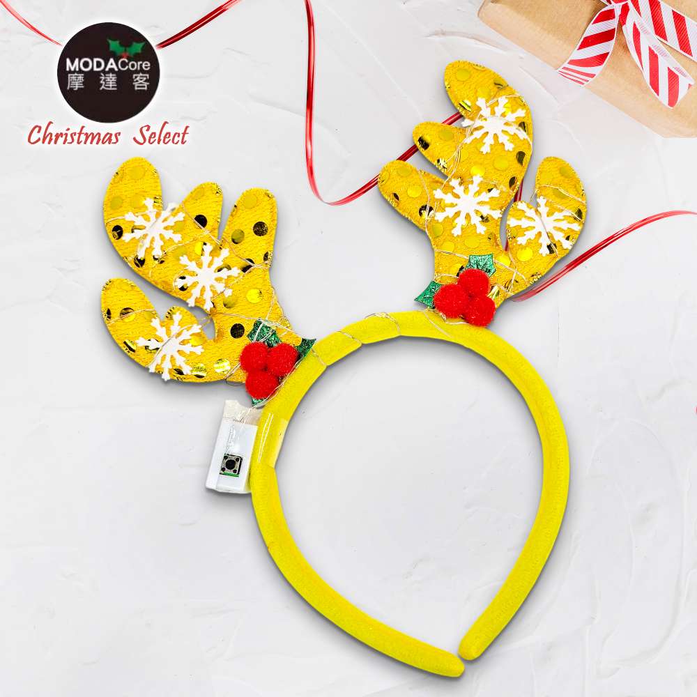 摩達客-聖誕雪花片鹿角髮箍黃色款+LED燈暖白光-耶誕派對交換禮物