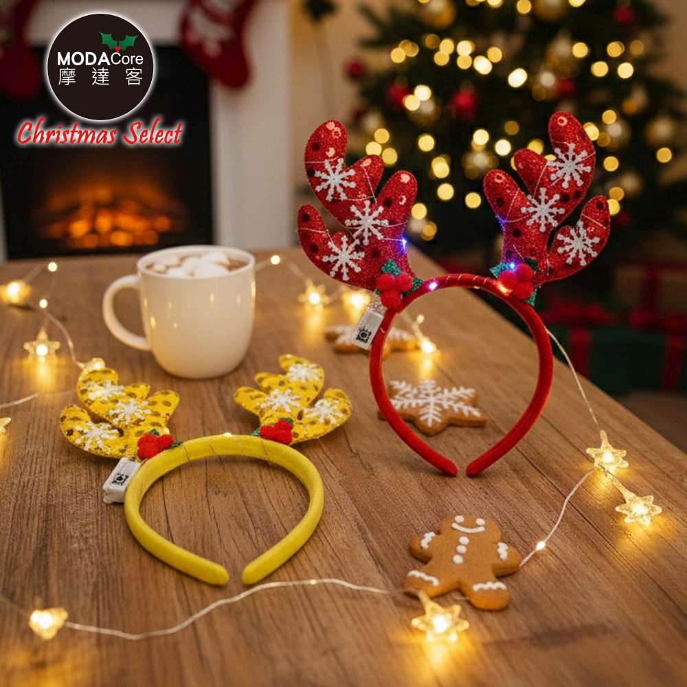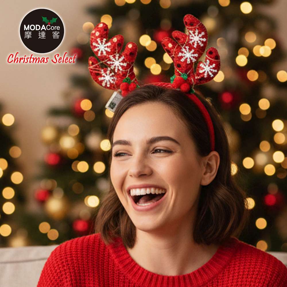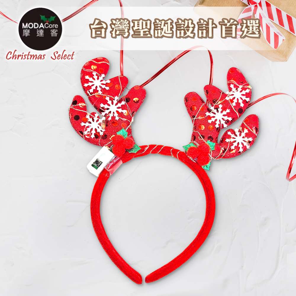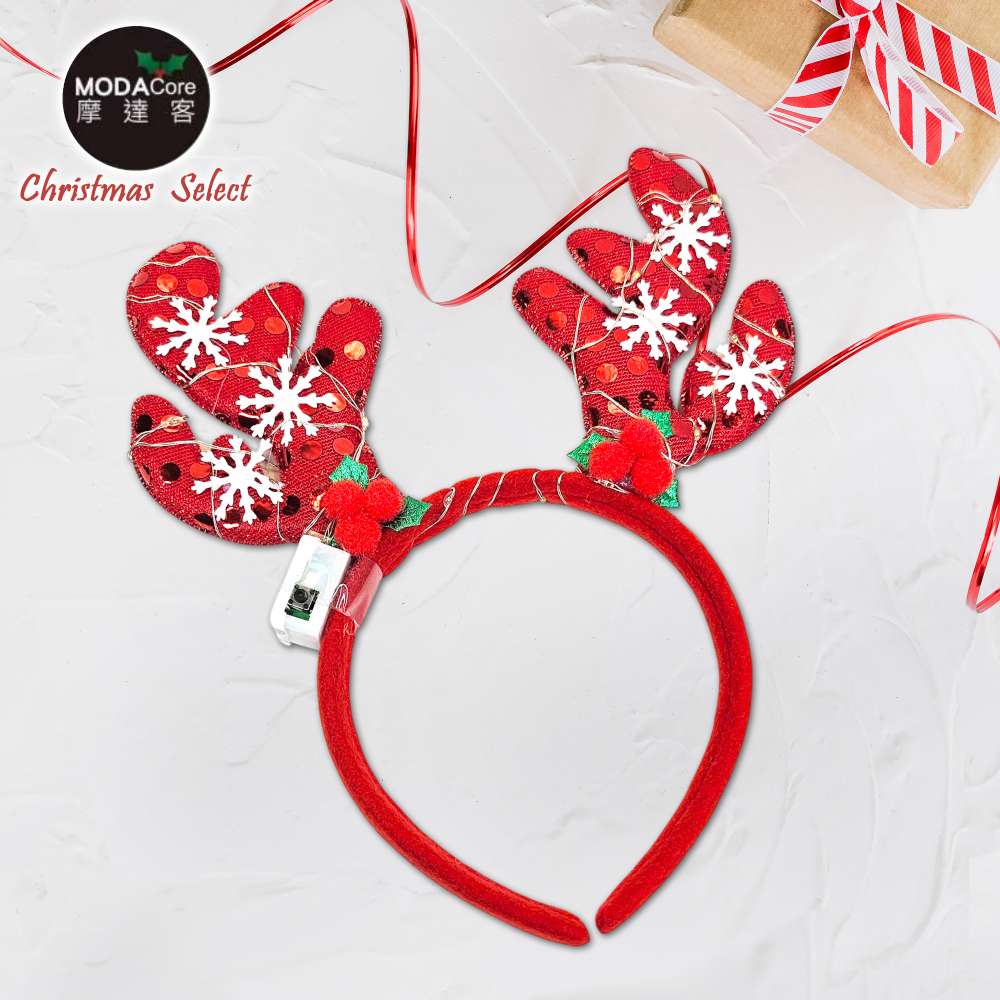 摩達客-聖誕雪花片鹿角髮箍紅色款+LED燈彩光-耶誕派對交換禮物