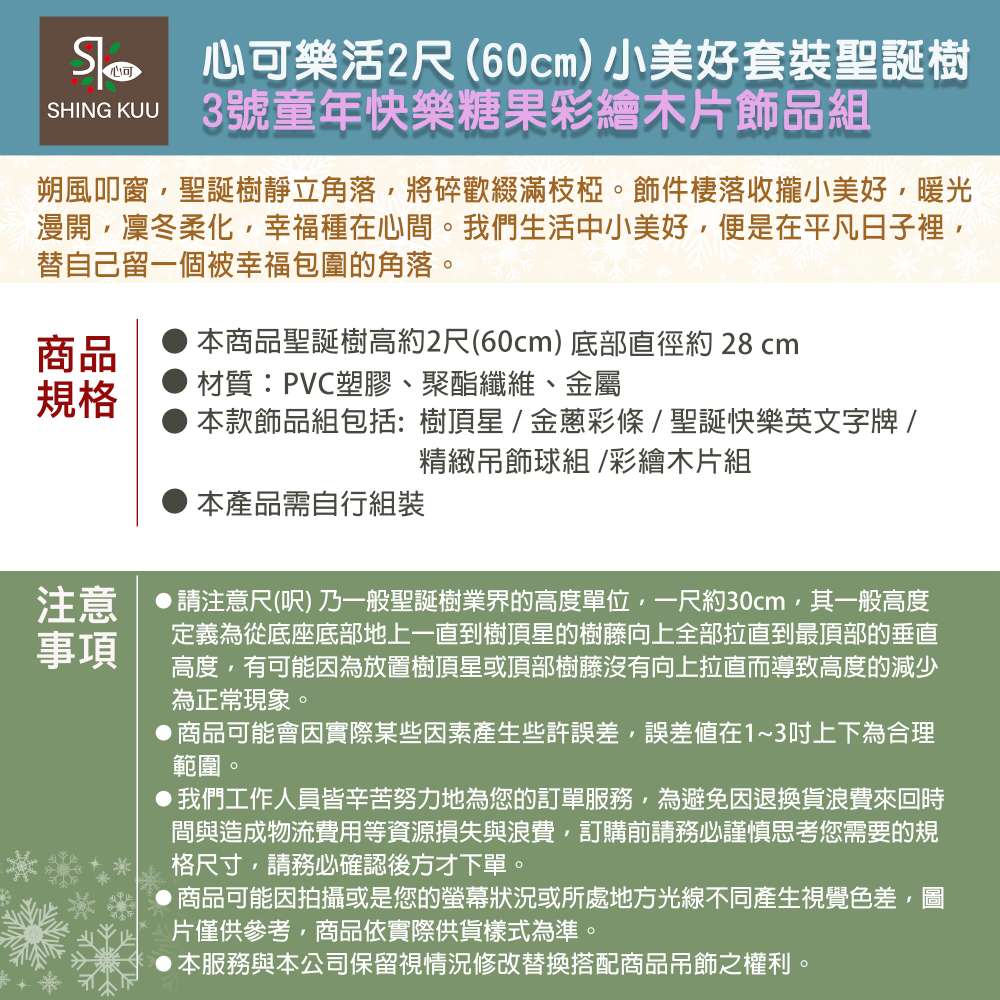 心可樂活-2尺60cm小美好套裝聖誕樹+3號童年快樂糖果彩繪木片飾品組+LED暖白光20燈雪花燈串_台灣本島免運費