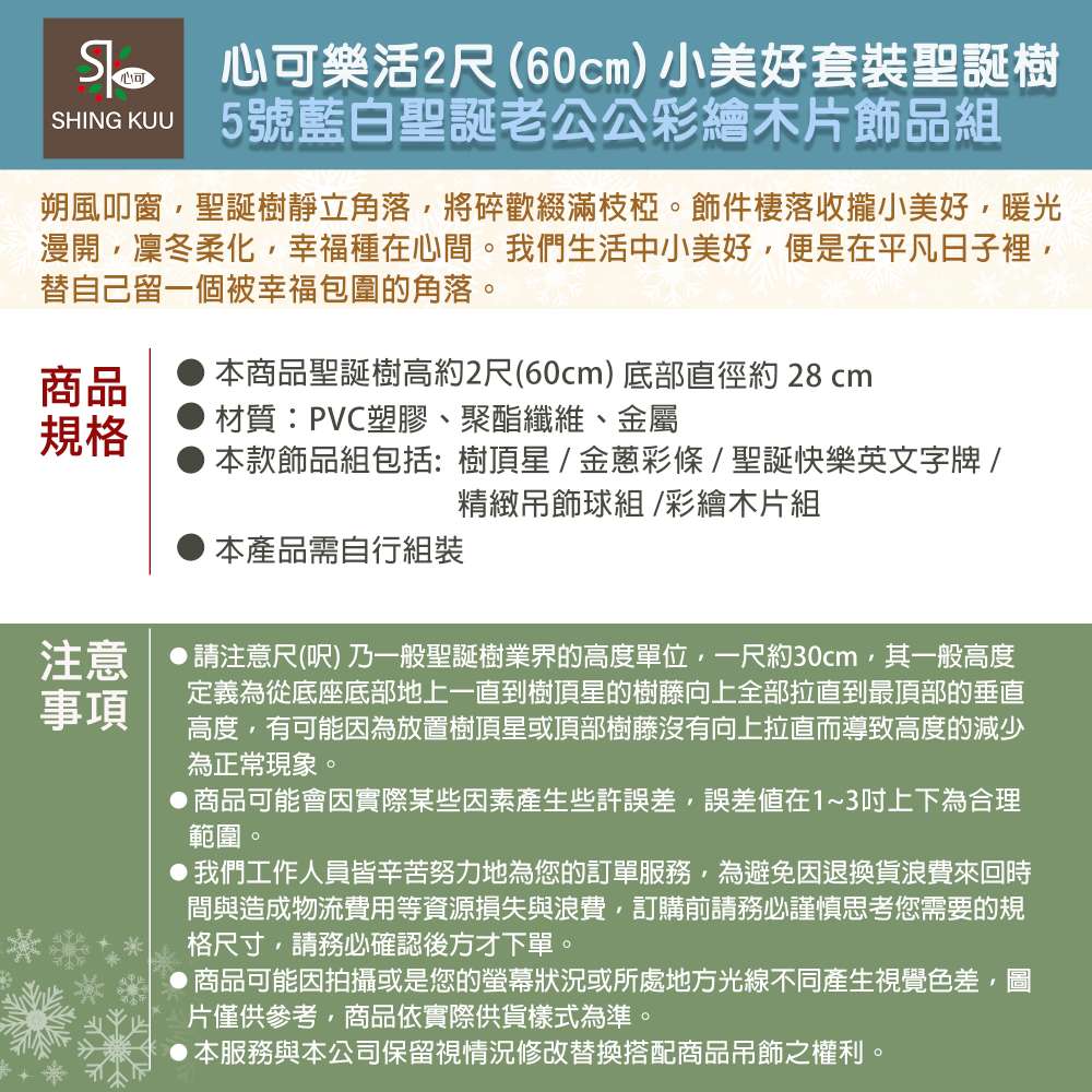 心可樂活-2尺60cm小美好套裝聖誕樹+5號藍白聖誕老公公彩繪木片飾品組+LED暖白光20燈雪花燈串_台灣本島免運費