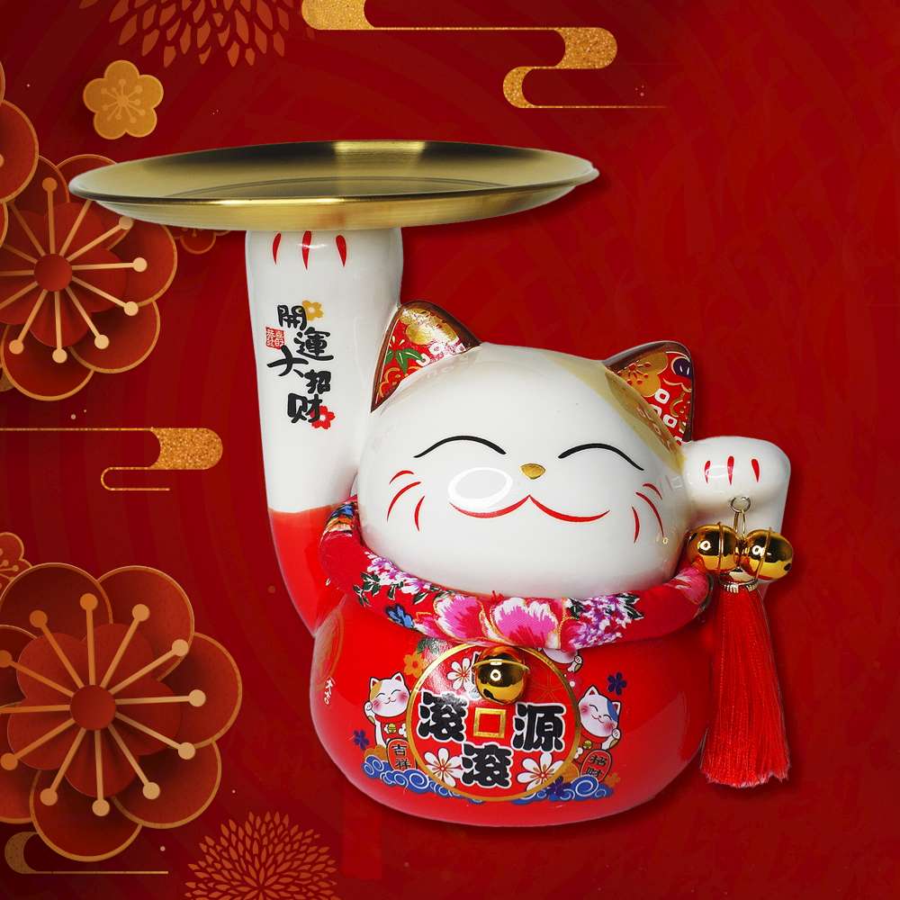 摩達客◉春節開運◉財源滾滾頂盤陶瓷招財貓-托盤紅色款_撲滿存錢桶擺飾桌飾