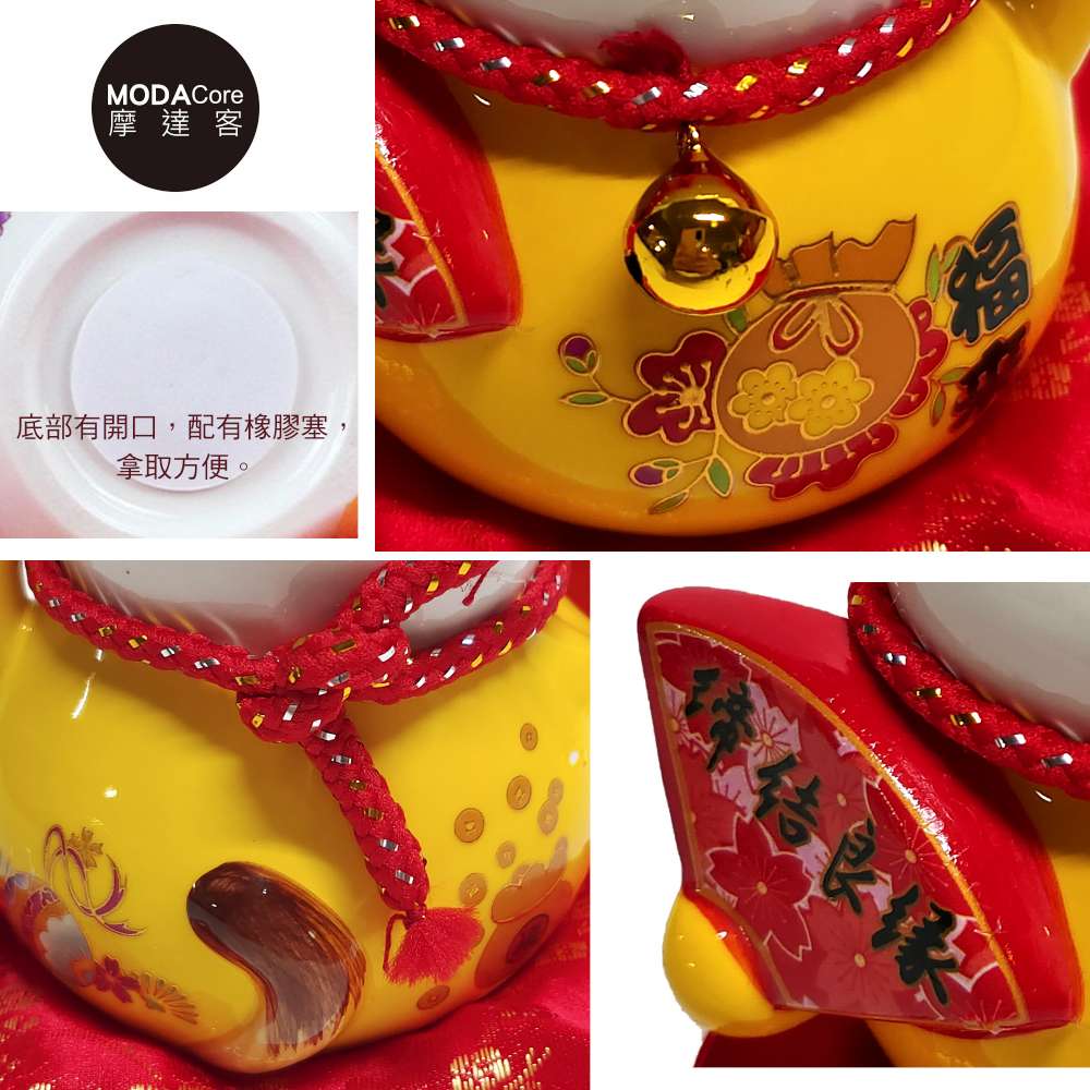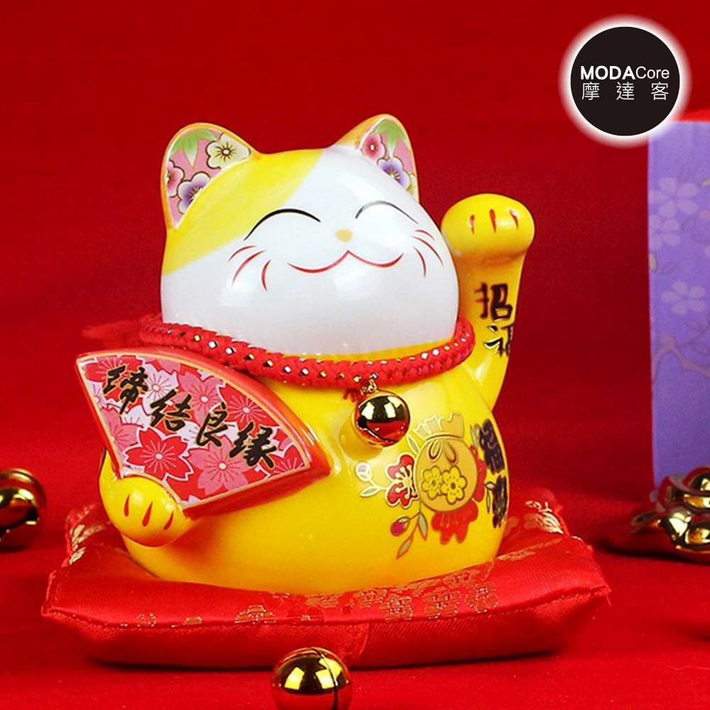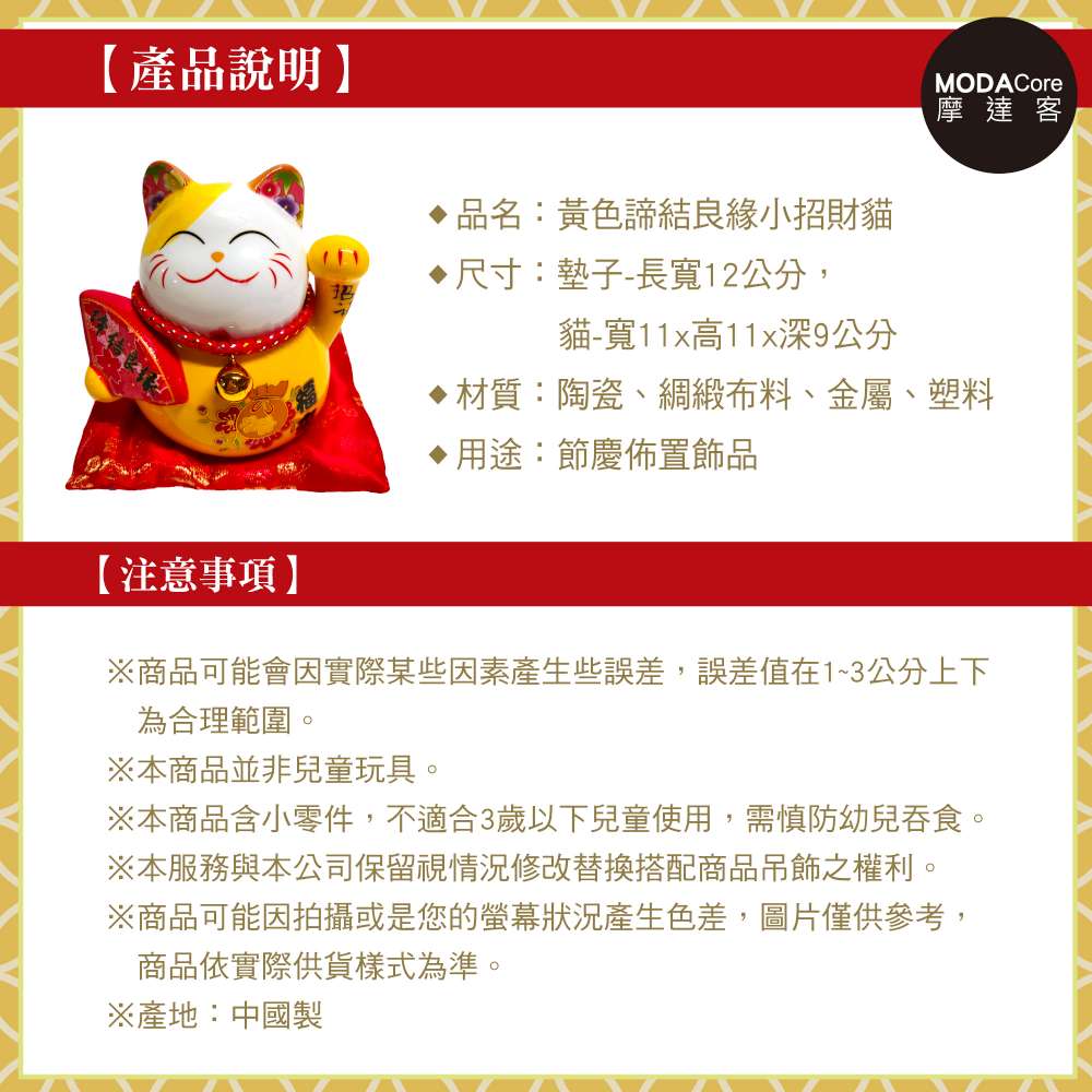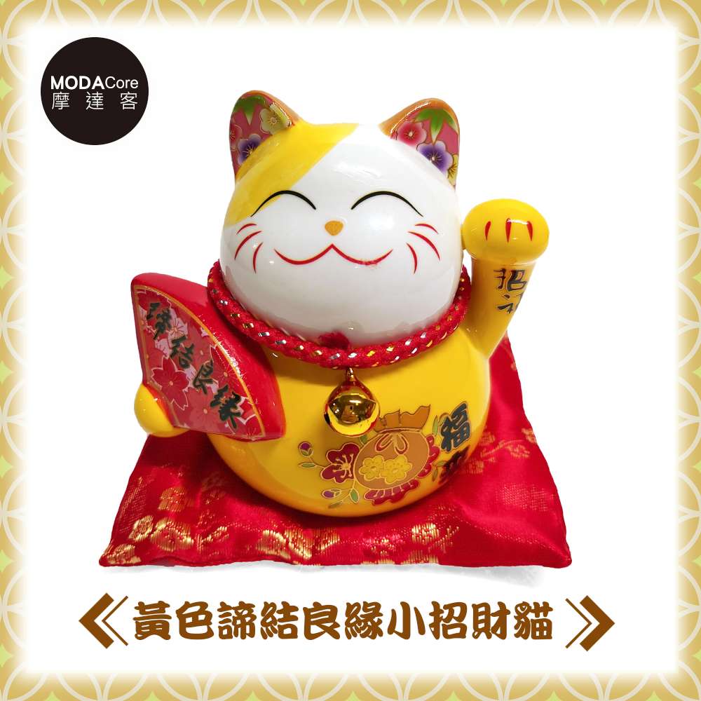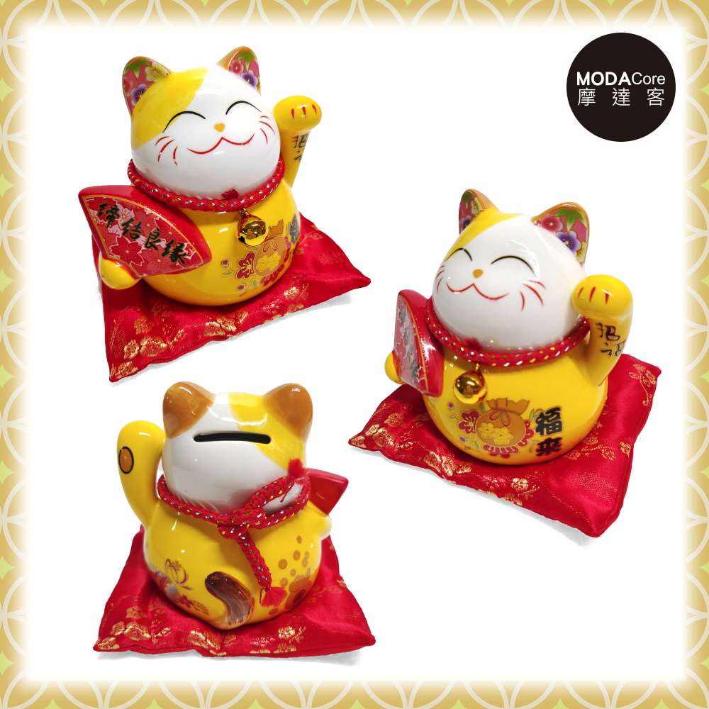 摩達客農曆春節◉4.5吋締結良緣黃色開運陶瓷招財貓/撲滿存錢桶擺飾(贈坐墊)