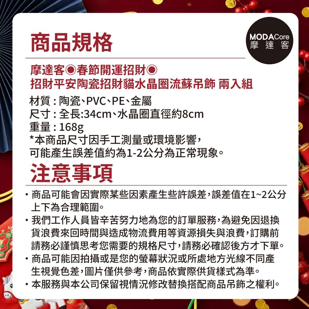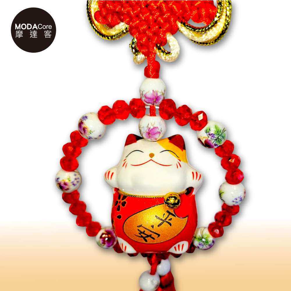 摩達客◉春節開運招財◉招財平安陶瓷招財貓水晶圈流蘇吊飾_兩入組