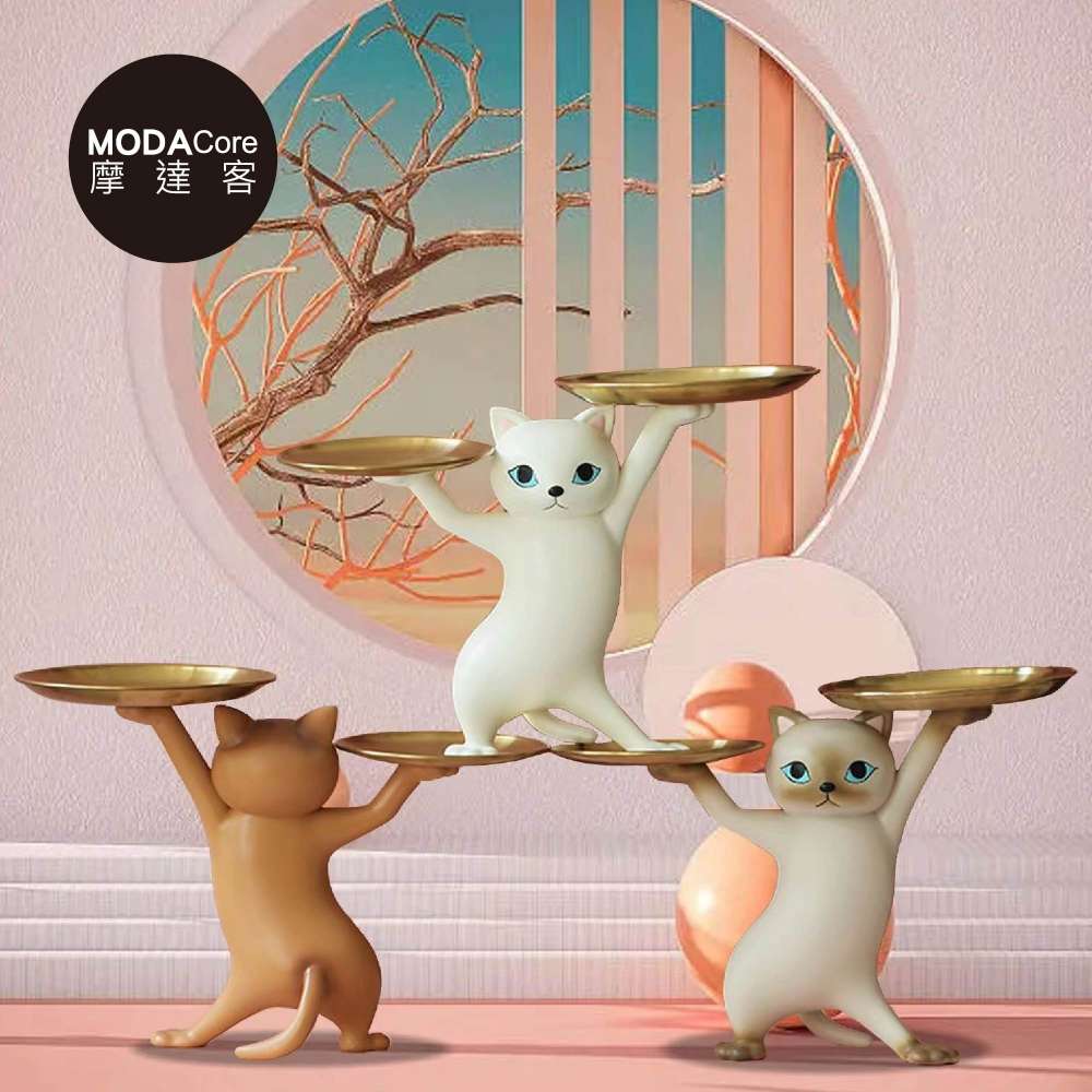 摩達客◉自信魅力好運貓頂托盤擺飾-高級灰白款-聚寶盆糖果收納