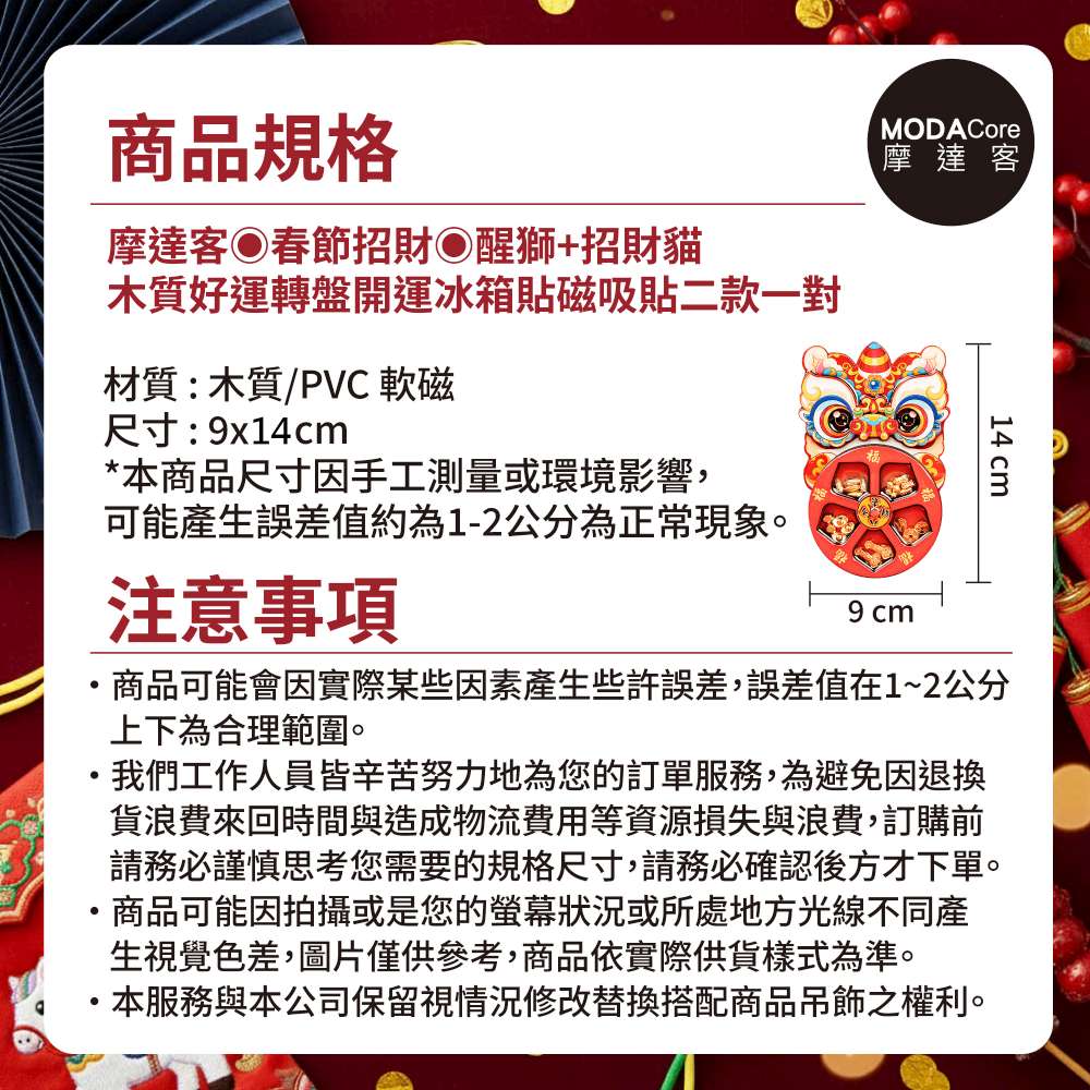 摩達客◉春節招財◉醒獅+招財貓木質好運轉盤開運冰箱貼磁吸貼二款一對 新年開春聯好運到