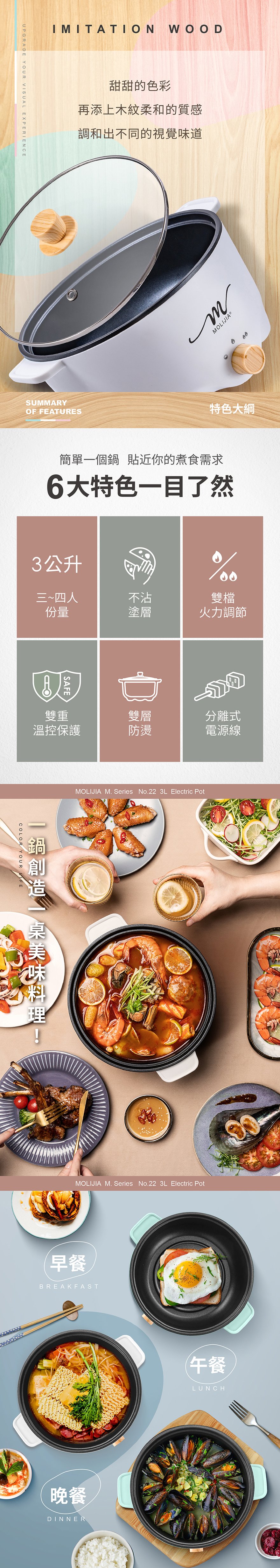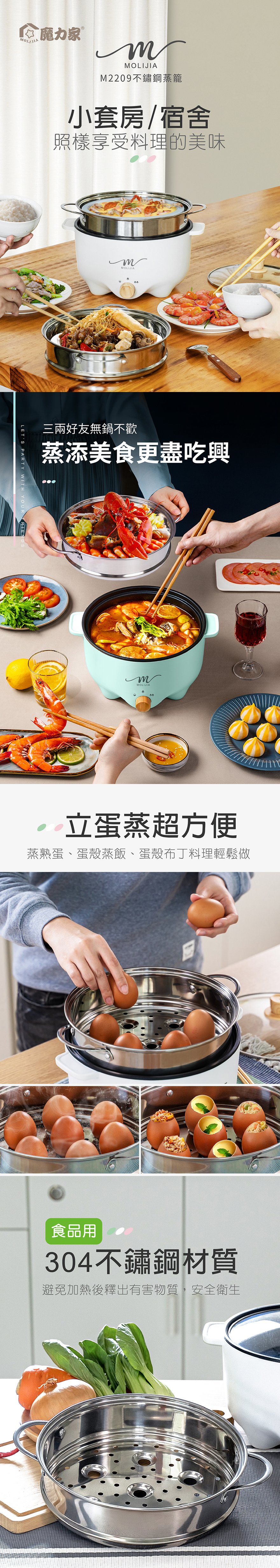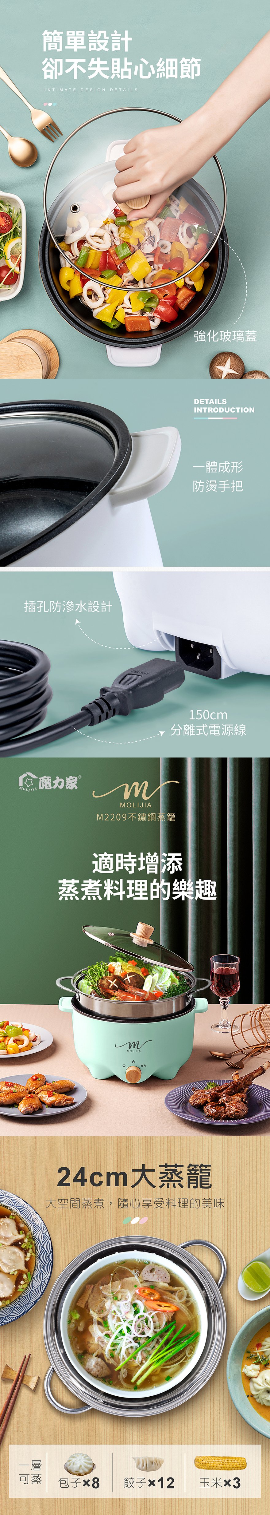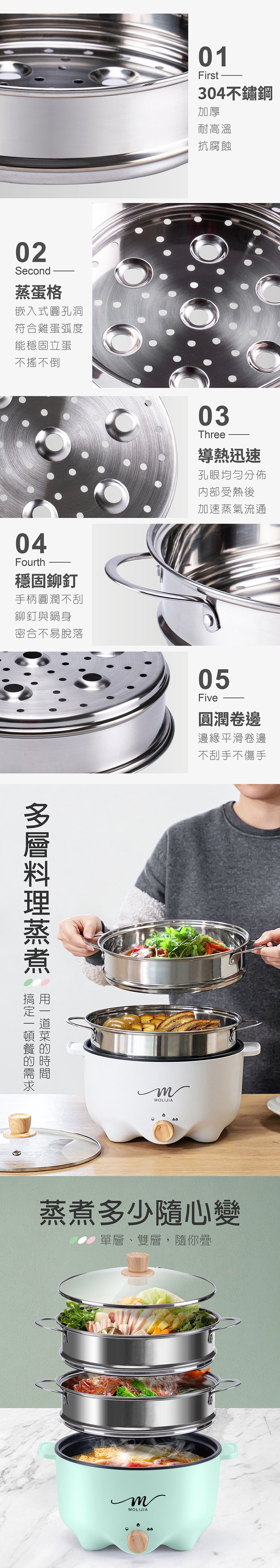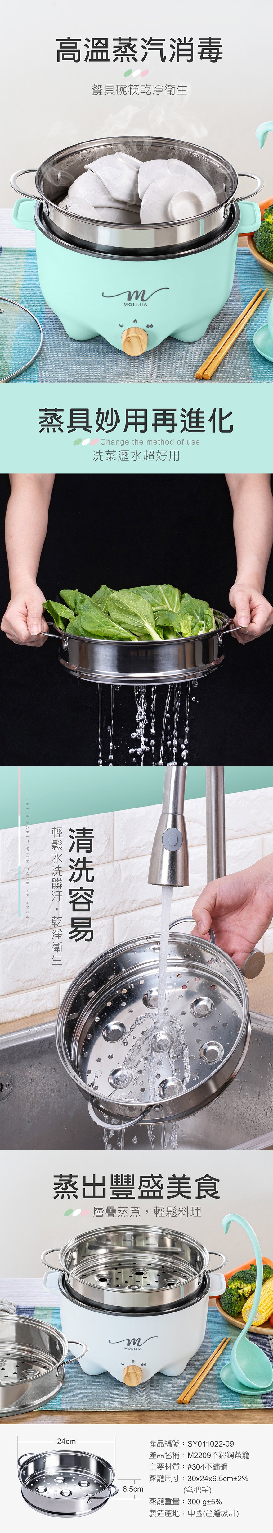 【 MOLIJIA 魔力家】3L-M22 多功能美食料理不沾快煮電火鍋+M2209不鏽鋼蒸籠-白木紋