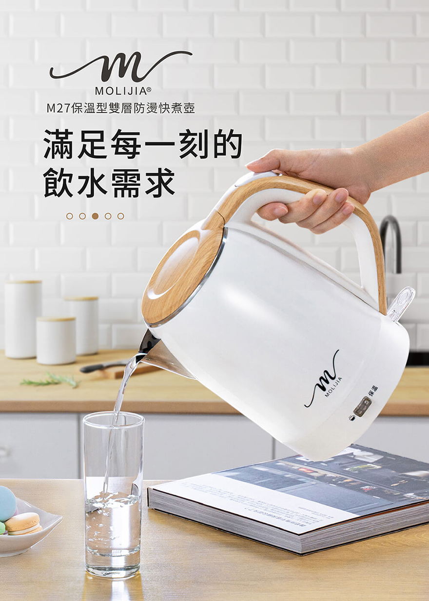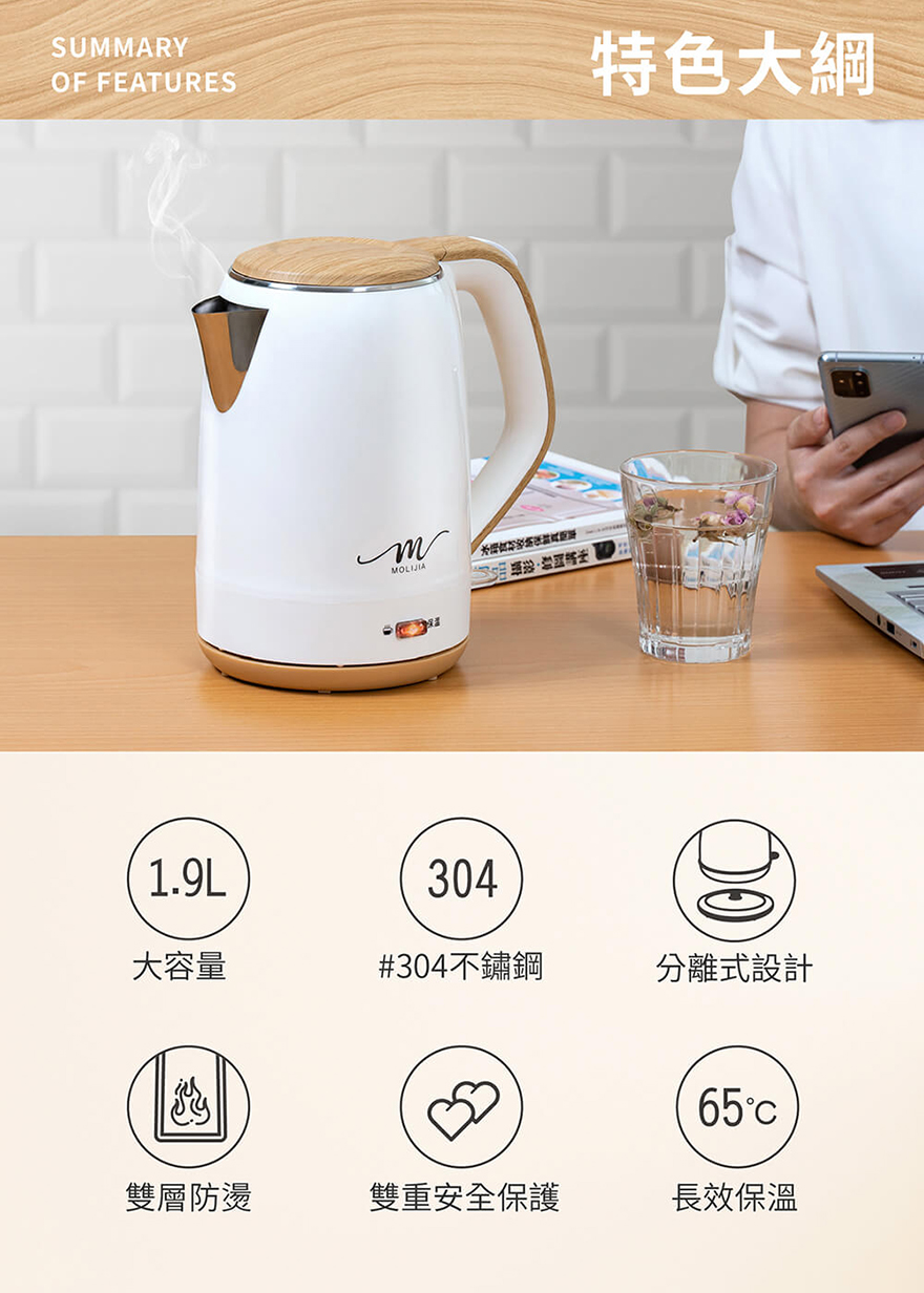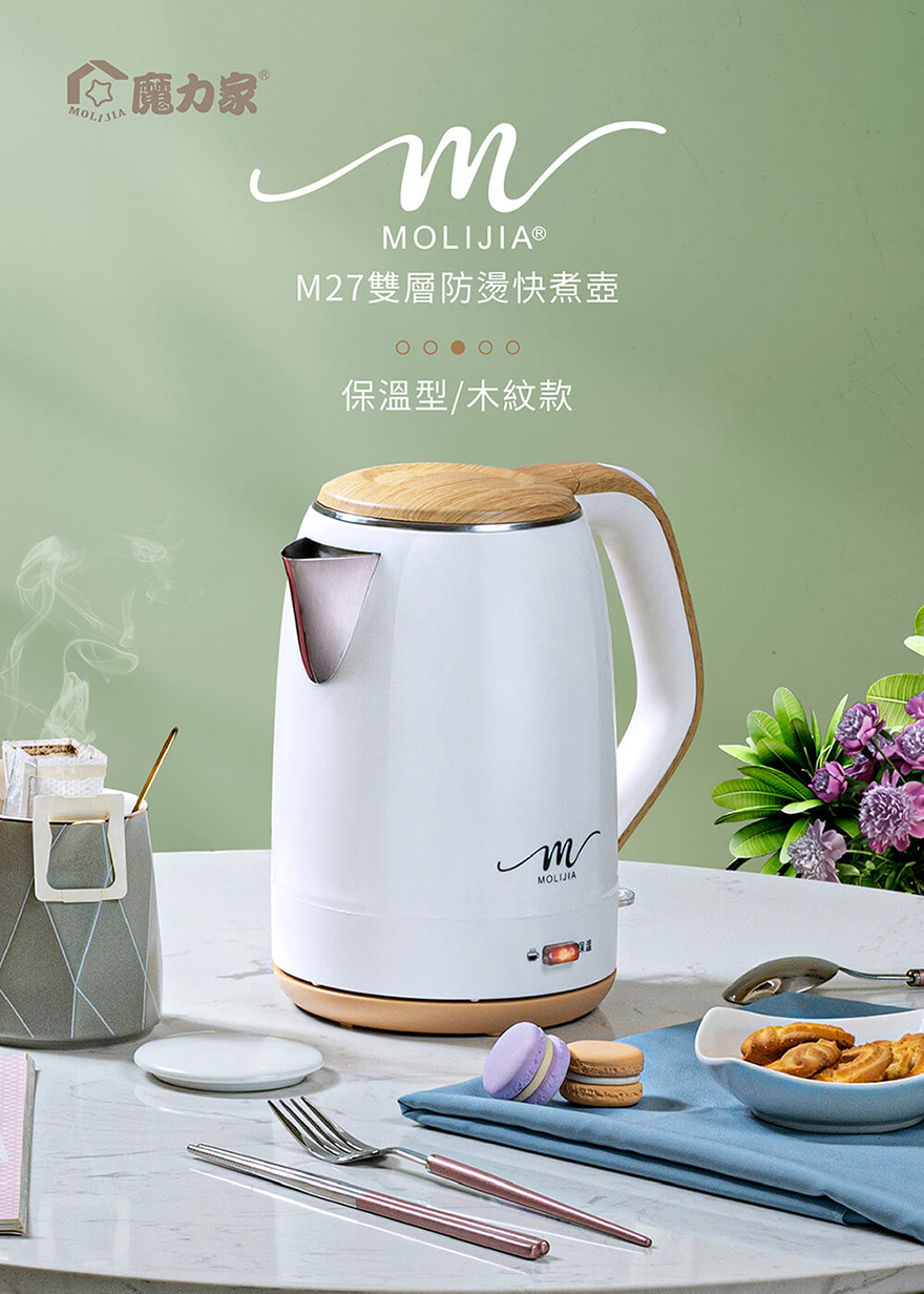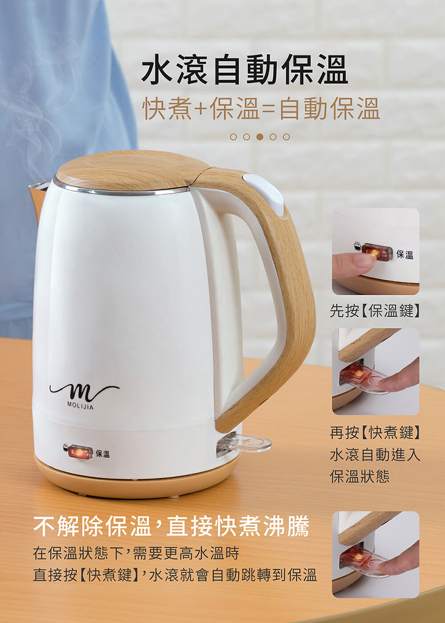 產品名稱:【MOLIJIA 魔力家】M27雙層防燙快煮壺1.9公升/保溫型/木紋款