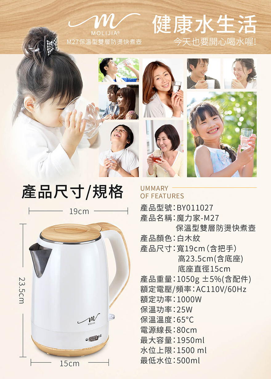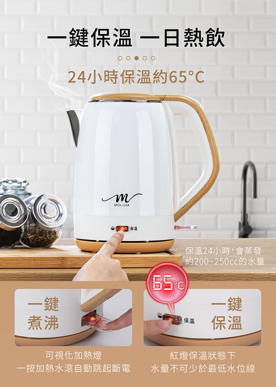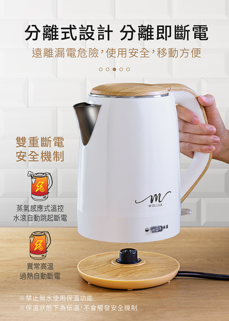 產品名稱:【MOLIJIA 魔力家】M27雙層防燙快煮壺1.9公升/保溫型/木紋款