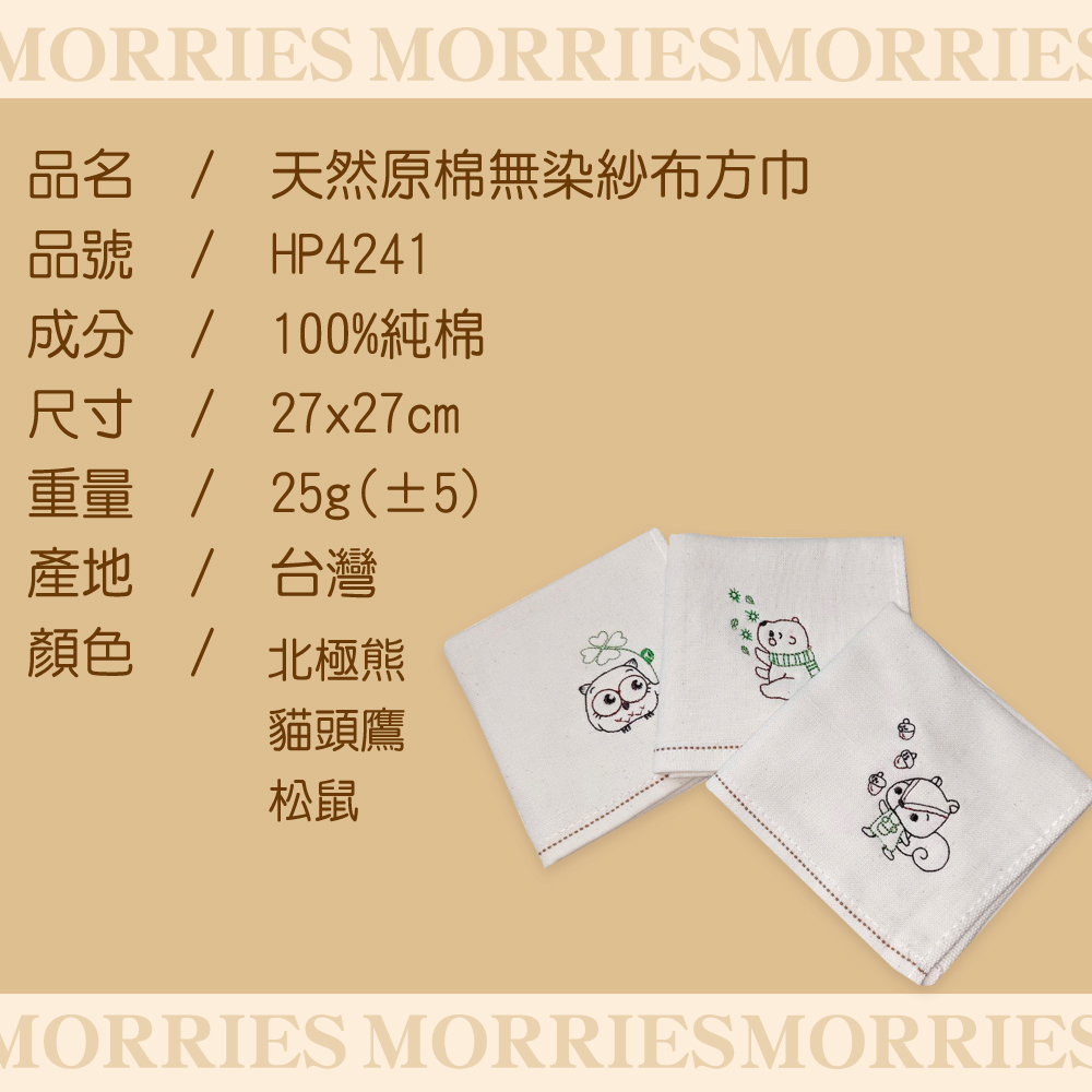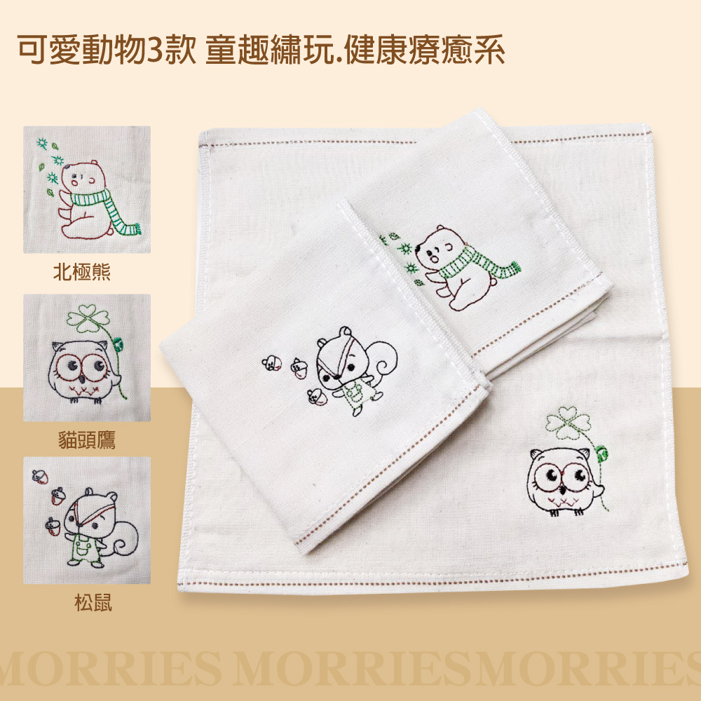 【MORRIES莫利仕】天然原棉無染童趣精繡童巾HP4141天然原棉。無染組合適合嬰幼兒肌膚微笑標章通過.可愛動物童趣精繡天然材質安全無刺激MIT台灣良品100%自然原棉毛巾微笑標章檢驗通過,推崇極簡健康,純棉材質親膚的舒適度〜MORRIES天然無染紗布方巾尺寸/-27 * 52CM圖案/熊、松鼠、貓頭鷹3款任選)材質/ 100%純棉 產地/ 台灣