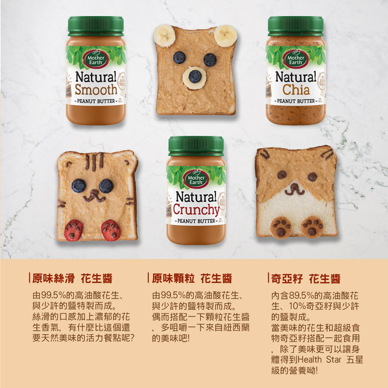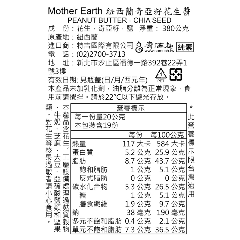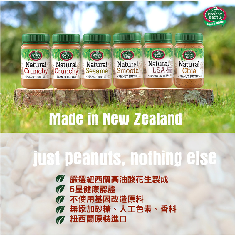 #紐西蘭#抹醬#奇亞籽#高油酸#涼拌#全素👉 全新包裝,全新式樣,新鮮上架✔採用紐西蘭高油酸花生,原裝進口來台,不易變質、不加糖、無多餘熱量,只用些許鹽巴帶出花生的香甜 ~✔美味的花生醬與奇亞籽混合,內含89.5%的高油酸花生、10%奇亞籽與少許的鹽製成,蛋白質含量高達25%。✔當花生和奇亞籽搭配一起食用,除了美味更可以讓身體得到Health Star 五星級的營養呦!! ✔是養生者必選的口味,富含蛋白質、鈣質的奇亞籽與香濃花生的結合,風味獨特不可不試✔Mother Earth訴求天然,產品皆極簡單純粹, 源自「大地母愛」👉奇亞籽口味成分:花生89.5%、奇亞籽10%、鹽細節:養生者必選的口味,富含蛋白質、鈣質的奇亞籽與香濃花生的結合,風味獨特不可不試• 內容規格 : 380g/瓶x3• 保存期限 : 12個月• 有效日期 : 如包裝上所示• 原產地(國) : 紐西蘭• 食用方式 : 可塗抹在吐司或依個人喜好食用 • 注意事項 : 本產品含有花生, 不適合對其過敏體質者食用 • 保存方式 : 置於陰涼乾燥處, 避免陽光直射, 開封後請儘早食用, 以免影響風味 ■ 代理廠商名稱 : 好健康國際有限公司■ 代理廠商電話 : 02-2675-5234■ 代理廠商地址 : 新北市樹林區千歲街57-7號■ 投保產品責任險字號 : 1504字第11PD02948號■ 食品業者登錄字號 : H-153997270-00000-7