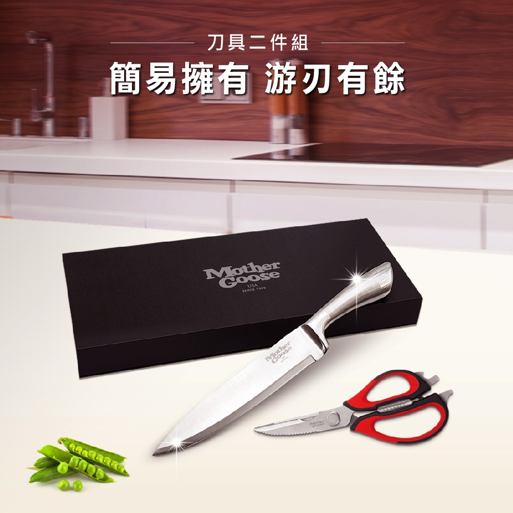 【美國MotherGoose鵝媽媽】食品級420不鏽鋼 二件刀具組 主廚刀+多功能廚房料理剪刀