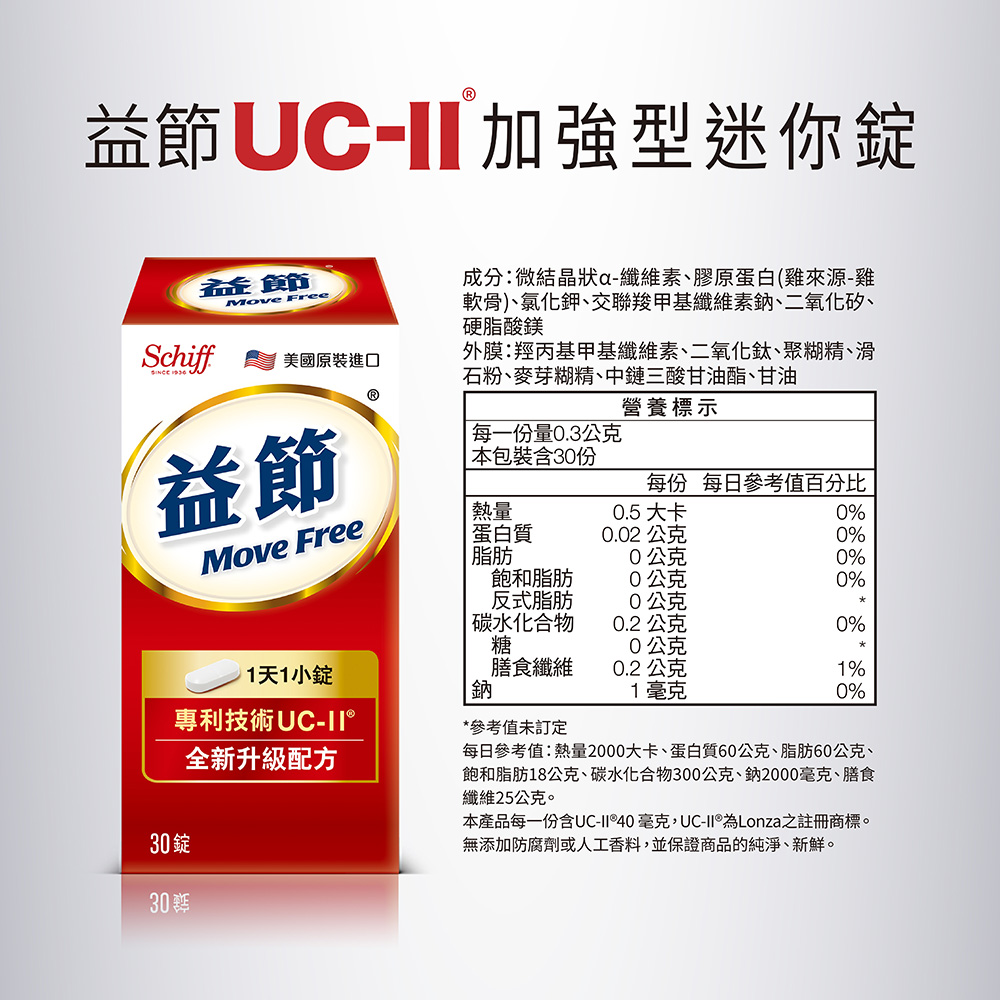 2.商品品名:MoveFree益節專利技術UCII加強型迷你錠1瓶(共30錠)