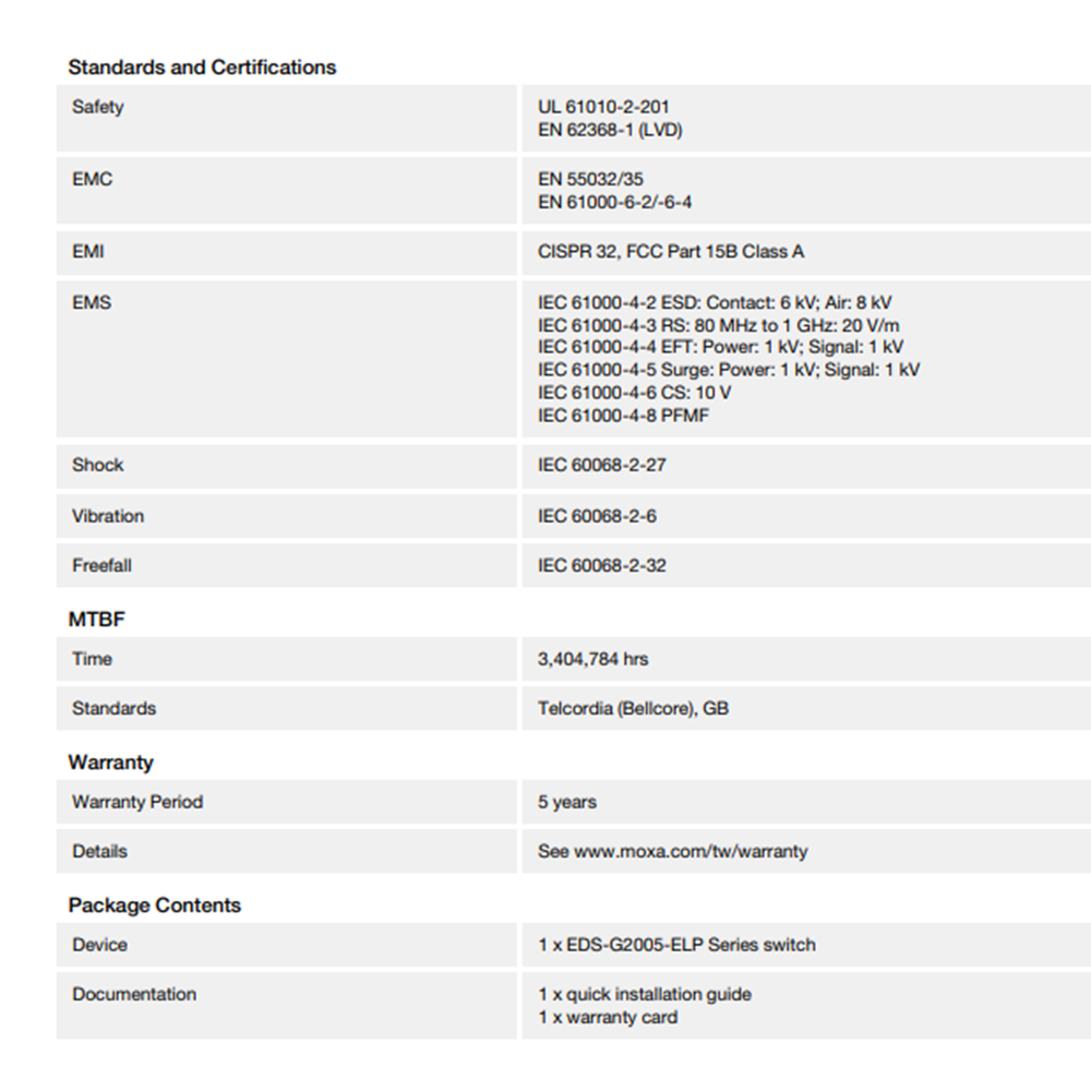 EDS-G2005-ELP系列具有12/24/48 VDC單電源輸入、DIN Rail鋁軌安裝,以及高等級EMI/EMC防護能力。除了小巧的尺寸之外,EDS-G2005-ELP系列也通過100%的高溫測試,確保在部署後能夠穩定運作。EDS-G2005-ELP系列具有-10至60°C的標準操作溫度範圍。