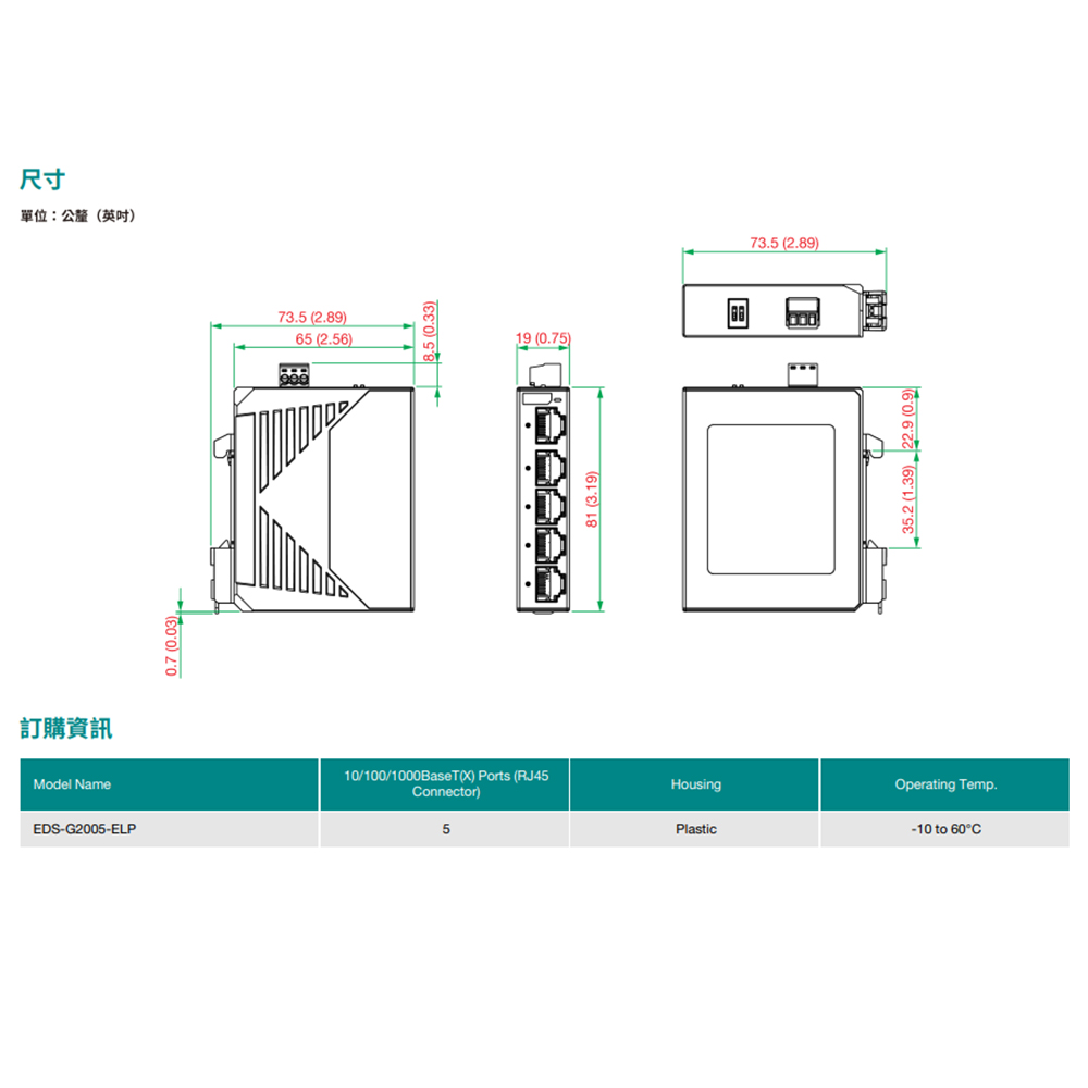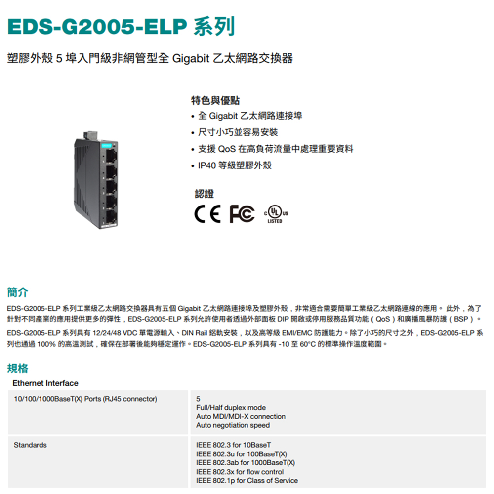 昌運監視器 MOXA EDS-G2005-ELP 塑膠外殼 5埠入門級非網管型 全Gigabit乙太網路交換器