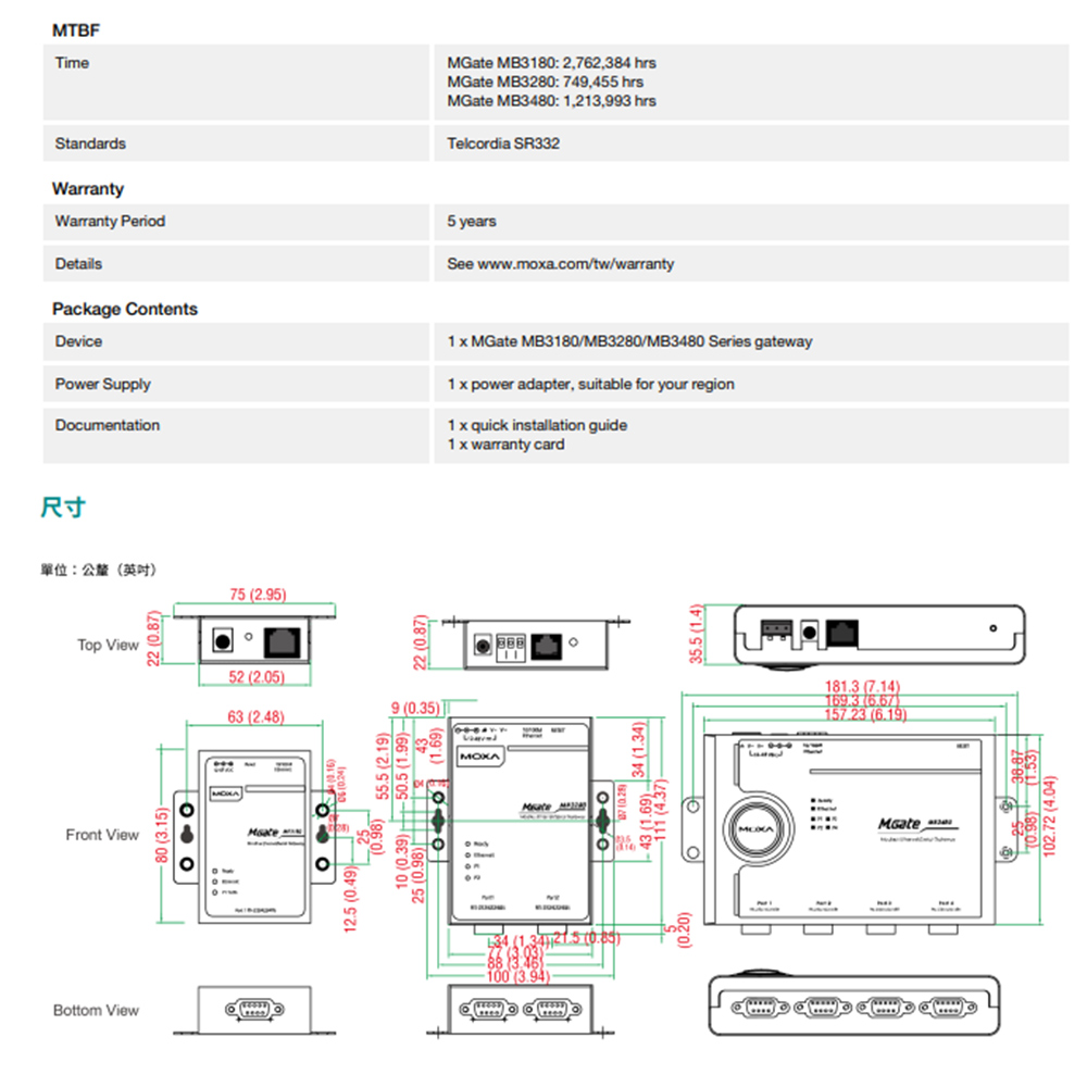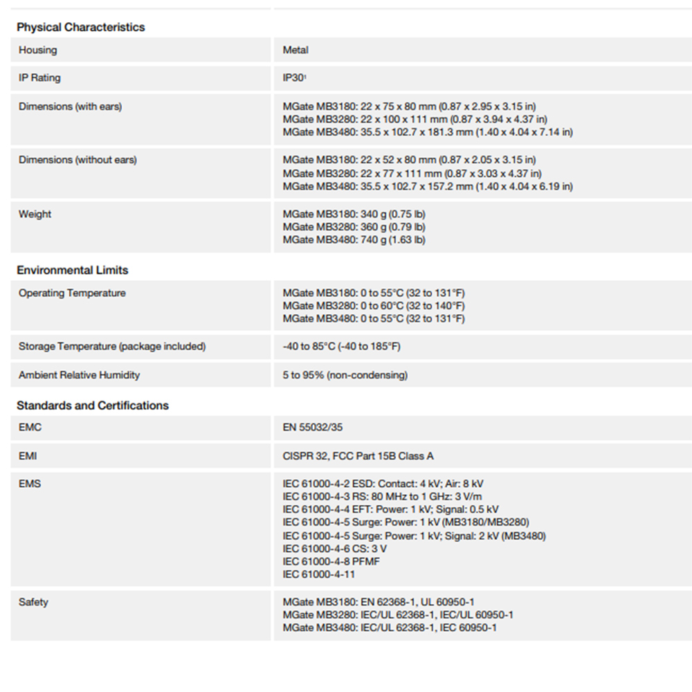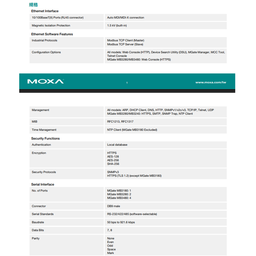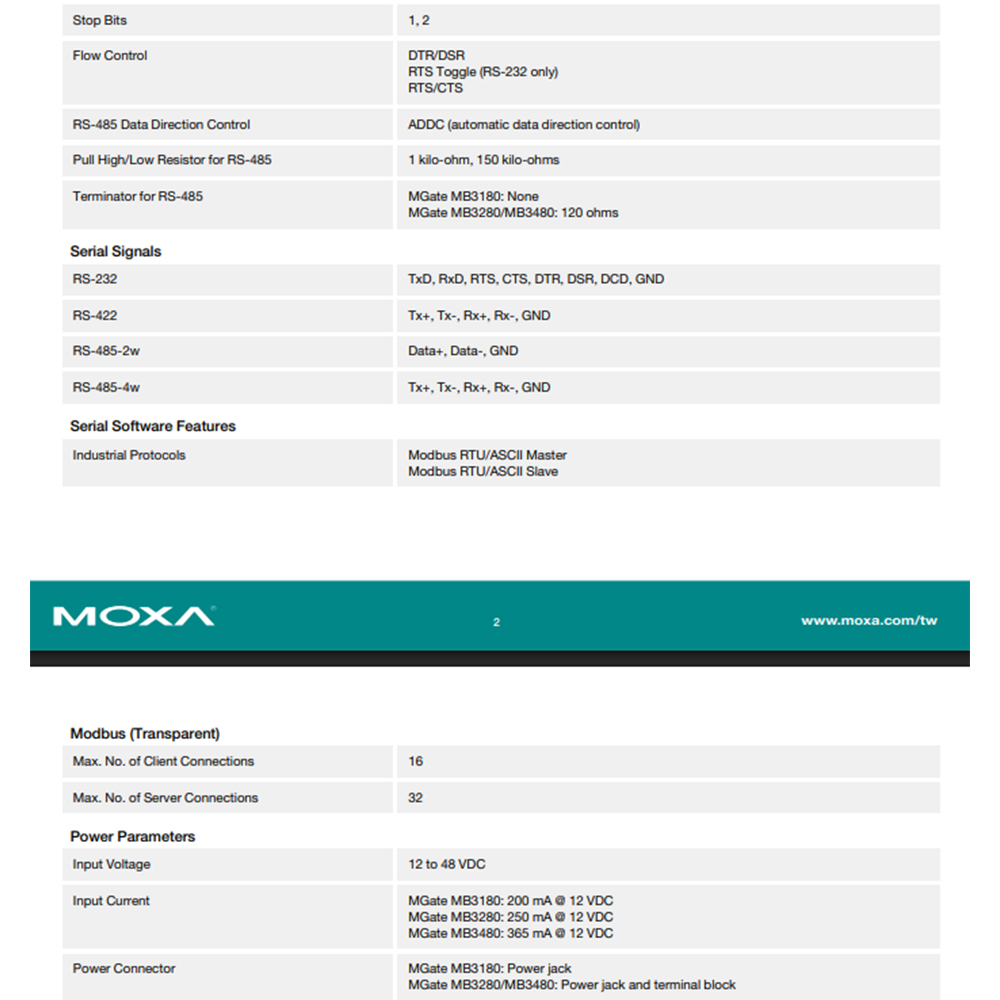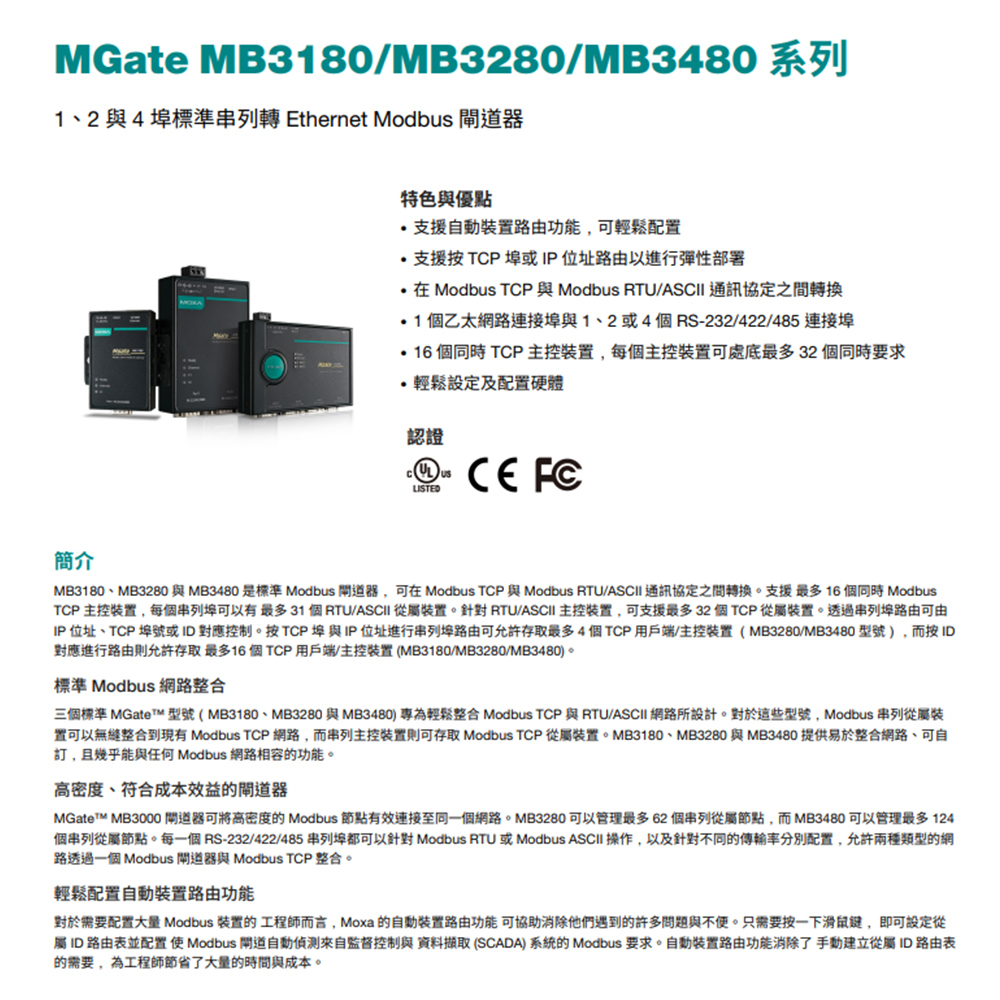 MB3180、MB3280與MB3480是標準Modbus閘道器,可在Modbus TCP與Modbus RTU/ASCII訊協定之間轉換。支援最多16個同時Modbus TCP主控裝置,每個串列埠可以有最多31個RTU/ASCII從屬裝置。針對RTU/ASCII主控裝置,可支援最多32個TCP從屬裝置。透過串列埠路由可由IP位址、TCP埠號或ID對應控制。按TCP埠與IP位址進行串列埠路由可允許存取最多4個TCP用戶端/主控裝置(MB3280/MB3480 型號),而按ID對應進行路由則允許存取最多16個TCP用戶端/主控裝置(MB3180/MB3280/MB3480)。