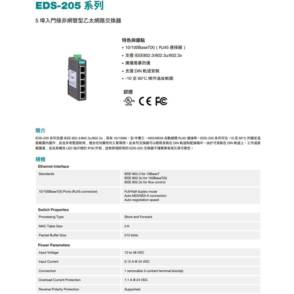 昌運監視器 MOXA EDS-205 5埠入門級非網管型 乙太網路交換器