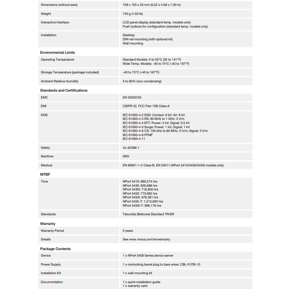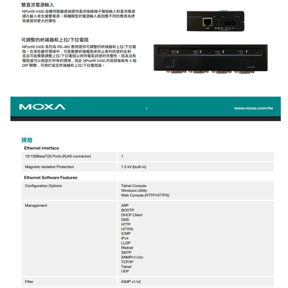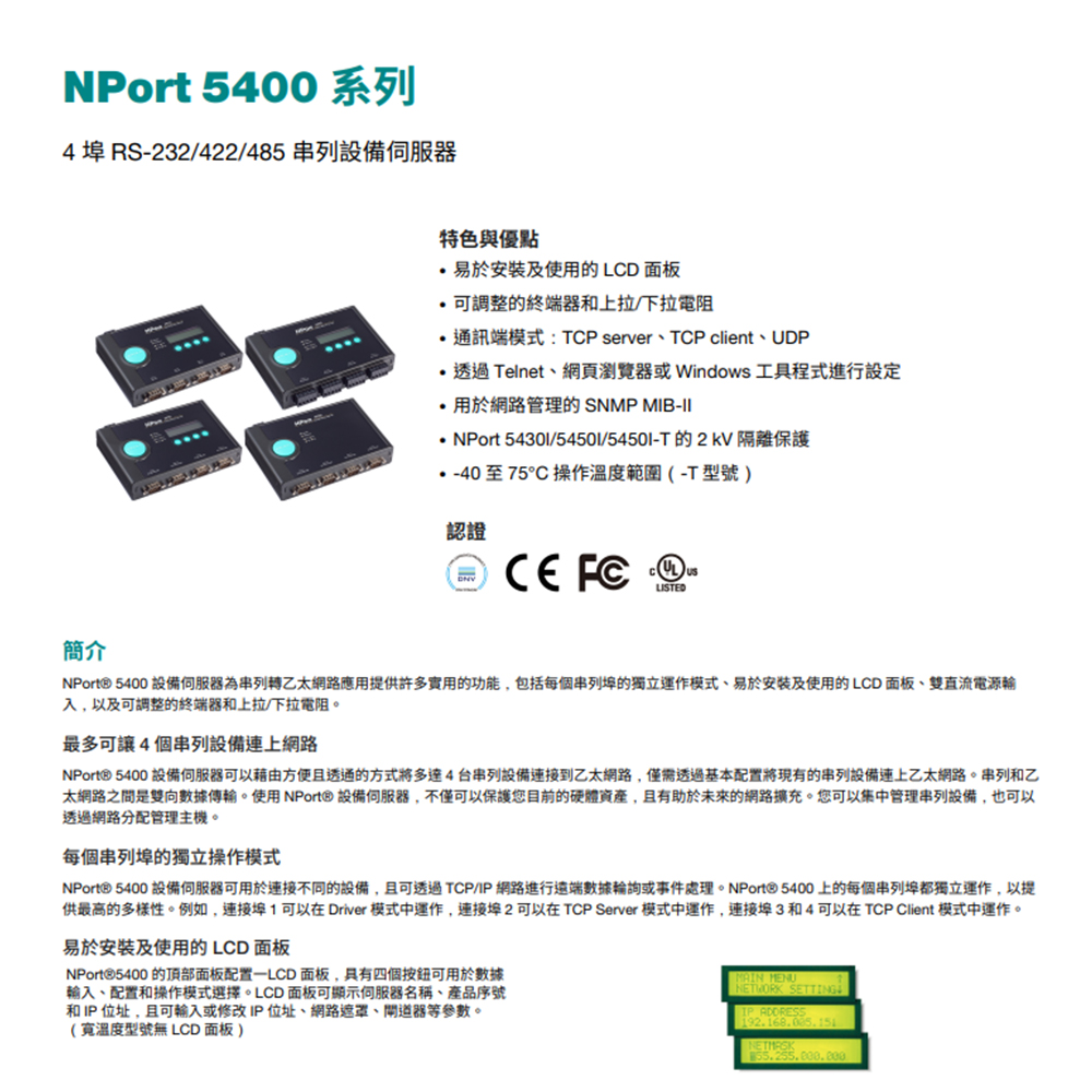 NPort 5400設備伺服器為串列轉乙太網路應用提供許多實用的功能,包括每個串列埠的獨立運作模式、易於安裝及使用的LCD面板、雙直流電源輸入,以及可調整的終端器和上拉/下拉電阻。