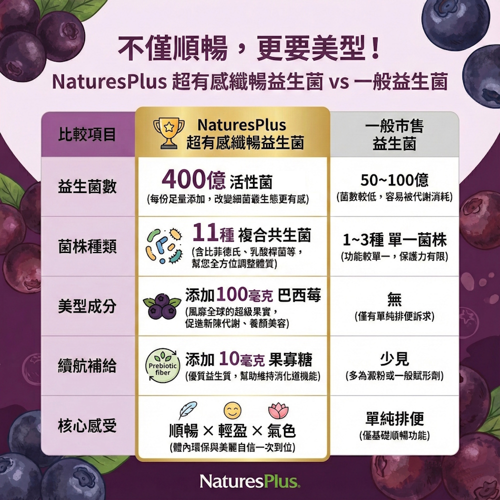 NaturesPlus 天然佳成立於1972年,在美銷售50餘年,美國保健營養食品領導品牌。我們擁有自己的實驗室及工廠,以便掌握研發及製造優質天然有機的保健營養食品。在這樣的條件下,不僅對於原物料的檢驗、加工製程的掌握、最終品質檢驗等,都可以確保產品的高品質。我們期待NaturesPlus 天然佳的保健營養食品,能夠帶給國人健康的身體,進而提升國人的生活品質。⭕️400億益生菌,讓你天天通順暢⭕️別在亂吃便宜無效的益生菌啦⭕️添加巴西莓,富含膳食纖維✅品名:超有感纖暢益生菌✅內容量:30顆✅有效日期:2026/03購買公司貨,隨貨附發票;買的放心,食在安心。【NaturesPlus 天然佳】 台灣總代理