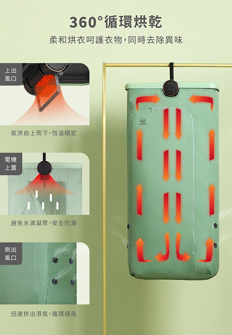 榮獲2021年台灣金點設計大獎 360度熱風循環,恆溫氣流柔和烘衣 雙重UV消毒,有效除菌/除霉/除臭 兩檔溫度模式,搭配各種布料 智能定時可達7小時 摺疊好收納,輕巧易攜帶 懸掛式設計,使用便利 外罩纖維柔韌,高效防風防水