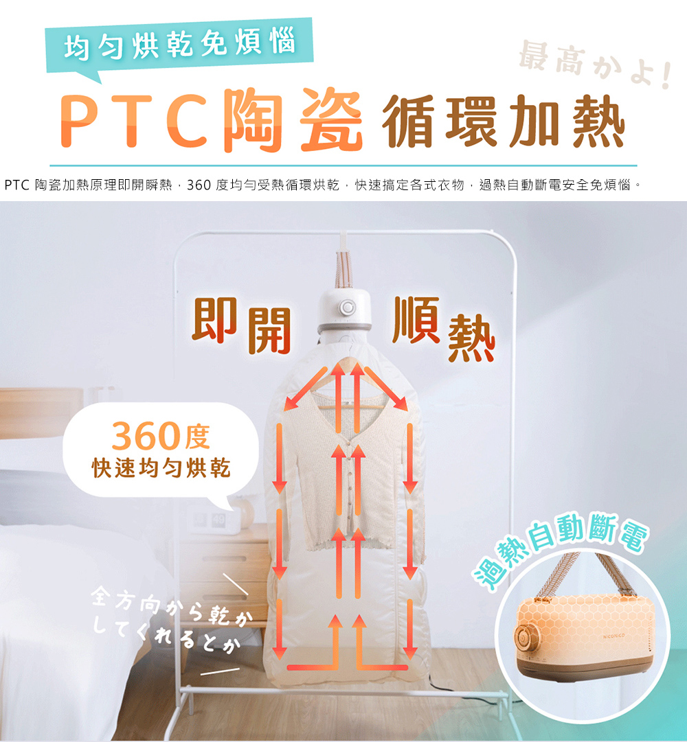 360度熱風循環,恆溫氣流柔和烘衣