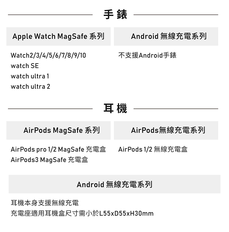 手錶x耳機x手機,三合一充電更輕鬆隨身攜帶無負擔,體積重量減半穩固磁吸充電,不會輕易脫落去除充電線,包包俐落乾淨Magsafe 無線充電,供電穩定MIT品質保證,四重安全細節嚴格檢驗符合BSMI與NCC認證高標準把關,全球暢行無阻鋁合金外殼,輕盈舒適散熱無負擔
