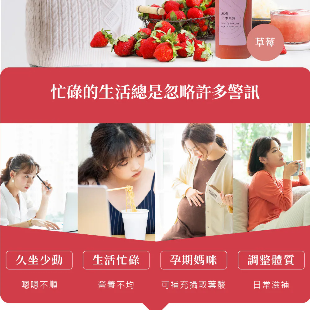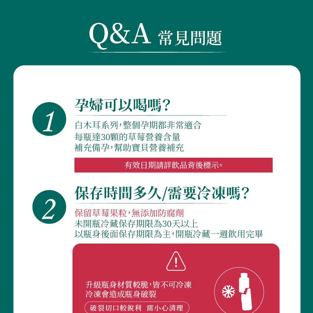 🎖️產地溯源,高架新鮮草莓直送,30顆草莓精華熬煮!🎖可補充攝取膳食纖維,幫助維持消化道機能🎖新鮮草莓,營養補給 | 孕媽媽神隊友🎖零顆粒木耳露❓常見Q&A❓Q1.孕婦可以喝嗎?A1.白木耳系列整個孕期都非常適合,黑木耳系列建議4個月以上可以定期飲用Q2.保存時間多久?如何保存?A2.全新製成,未開封冷藏保存期限約30日左右,以瓶身後面保存期限為主,因飲品皆為無添加,開瓶後建議一週內飲用完畢。‼️請注意不可冷凍避免造成瓶身破裂‼️Q3.可否加熱飲用?A3.可以,可依照個人喜好倒入適合的容器中,用電鍋、微波、隔水加熱皆可加熱後攪拌均勻盡快飲用完畢,不能久放也請勿放回冷藏(若有添加珊瑚草產品則不建議加熱)🍵加熱建議🍵微波加熱:30-60秒隔水加熱:小火慢煮60秒電鍋加熱:外鍋加入1/4碗水Q4.建議飲用量?A4.建議每日500c.c.以上,黑、白木耳可協助維持消化道機能!*因產品皆為無添加防腐劑、抗氧化劑、制酸劑,若有遇飲品配達有失溫或者變質情形請立即聯絡客服回收及後續服務☎️客服專線:0800-001-394🗒️LINE:@okasang🤵♀️客服服務時間:一、二 8:30-17:00三、四 、五 8:30-21:00六、日 10:00-21:00