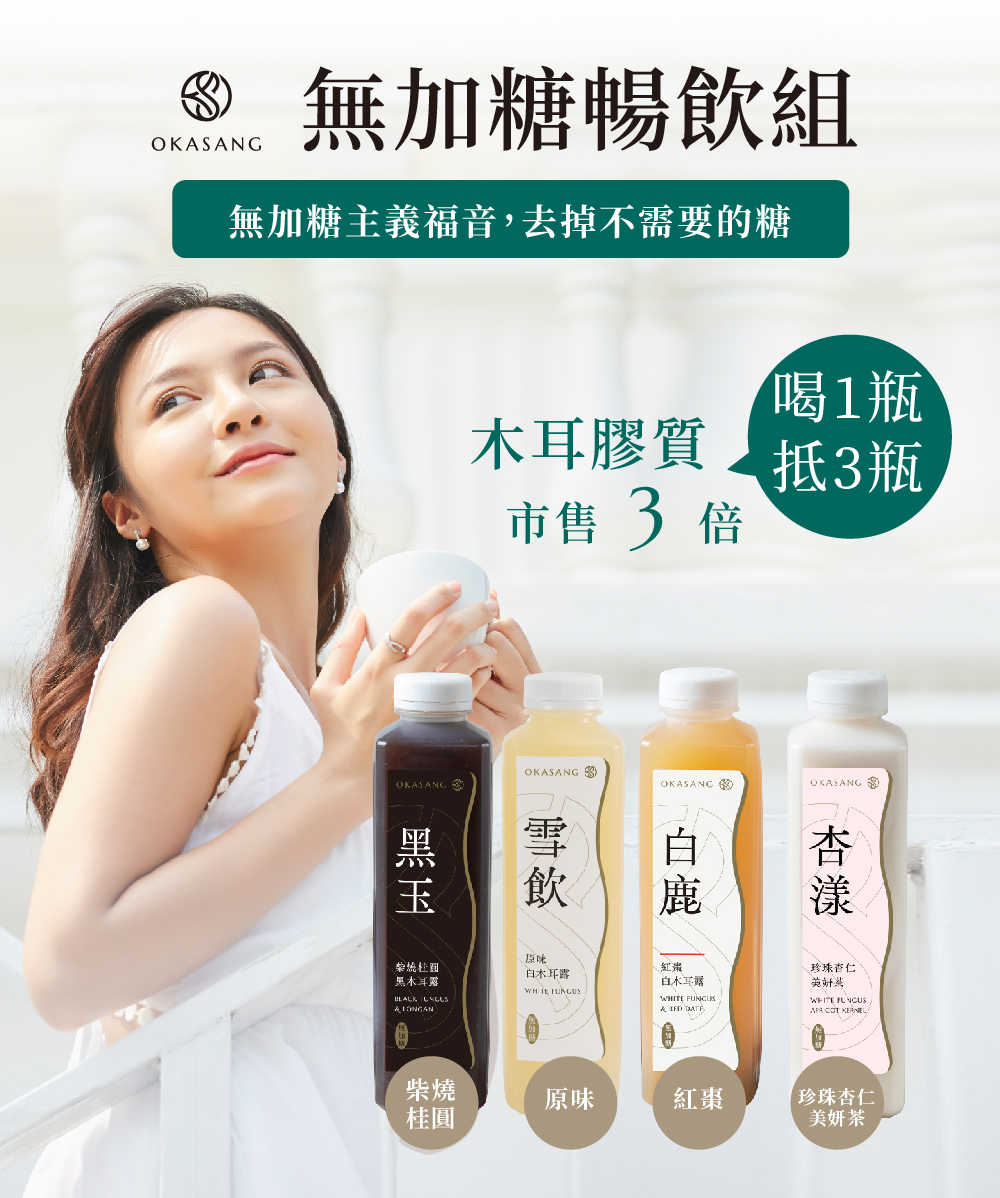 柴燒桂圓黑木耳露(無加糖):水、黑木耳、柴燒龍眼乾/原味白木耳露(無加糖):水、白木耳 / 紅棗白木耳露(無加糖):水、白木耳、紅棗/珍珠杏仁美妍茶(無加糖):水、南杏仁、白木耳、珍珠粉