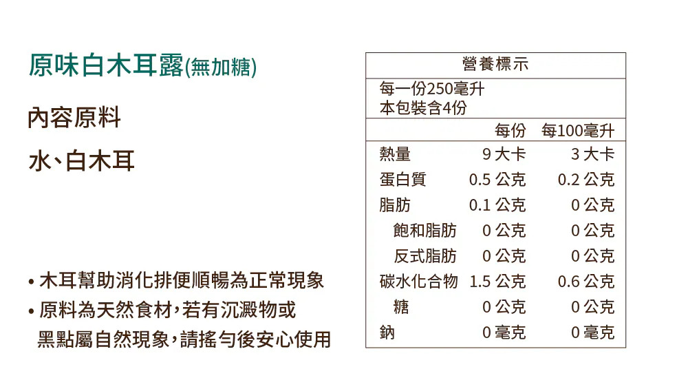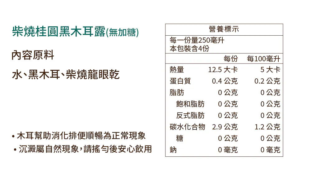 -柴燒桂圓黑木耳露(無加糖)- 每一份量250毫升,本包裝含4份 -每份- 熱量:12.5大卡 蛋白質:0.4公克 脂肪:0公克 飽和脂肪:0公克 反式脂肪:0公克 碳水化合物:2.9公克 糖:0公克 鈉0毫克 -每100毫升- 熱量:5大卡 蛋白質:0.2公克 脂肪:0公克 飽和脂肪:0公克 反式脂肪:0公克 碳水化合物:1.2公克 糖:0公克 鈉:0毫克 -原味白木耳露(無加糖- 每一份量250毫升,本包裝含4份 -每份- 熱量:9大卡 蛋白質:0.5公克 脂肪:0.1公克 飽和脂肪:0公克 反式脂肪:0公克 碳水化合物:1.5公克 糖:0公克 鈉:0毫克 -每100毫升- 熱量:3大卡 蛋白質:0.2公克 脂肪:0公克 飽和脂肪:0公克 反式脂肪:0公克 碳水化合物:0.6公克 糖:0公克 鈉:0毫克