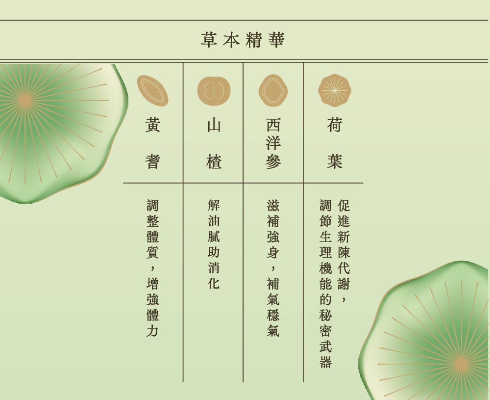 -【紅潤公事_頂級紅棗精華】- 紅棗萃取液、蘋果濃縮汁、枸杞萃取液 -【荷葉代謝茶】- 荷葉、山楂、決明子、黃耆、陳皮、甘草、明日葉、西洋蔘 *每包以1000c.c.熱開水沖泡20分鐘,如用500c.c.容器可回沖一次 一天2包每餐飯後熱熱飲用為佳
