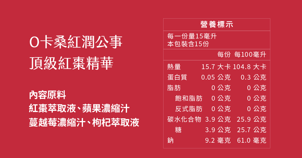 -【紅潤公事_頂級紅棗精華】- 每一份量15毫升,本包裝含15份 -每份- 熱量:15.7大卡 蛋白質:0.05公克 脂肪:0公克 飽和脂肪:0公克 反式脂肪:0公克 碳水化合物:3.9公克 糖:3.9公克 鈉:9.2毫克 -每100毫升- 熱量:104.8大卡 蛋白質:0.3公克 脂肪:0公克 飽和脂肪:0.公克 反式脂肪:0公克 碳水化合物:25.9公克 糖:25.7公克 鈉:61毫克 -【透亮公事_冰晶番茄精華(體驗組(2包)】- 每一份量15毫升,本包裝含2份 -每份- 熱量:8.5大卡 蛋白質:0.03公克 脂肪:0公克 飽和脂肪:0公克 反式脂肪:0公克 碳水化合物:2.1公克 糖:1.8公克 鈉:9.6毫克 -每100毫升- 熱量:56.4大卡 蛋白質:0.2公克 脂肪:0公克 飽和脂肪:0.公克 反式脂肪:0公克 碳水化合物:13.9公克 糖:12.3公克 鈉:64毫克