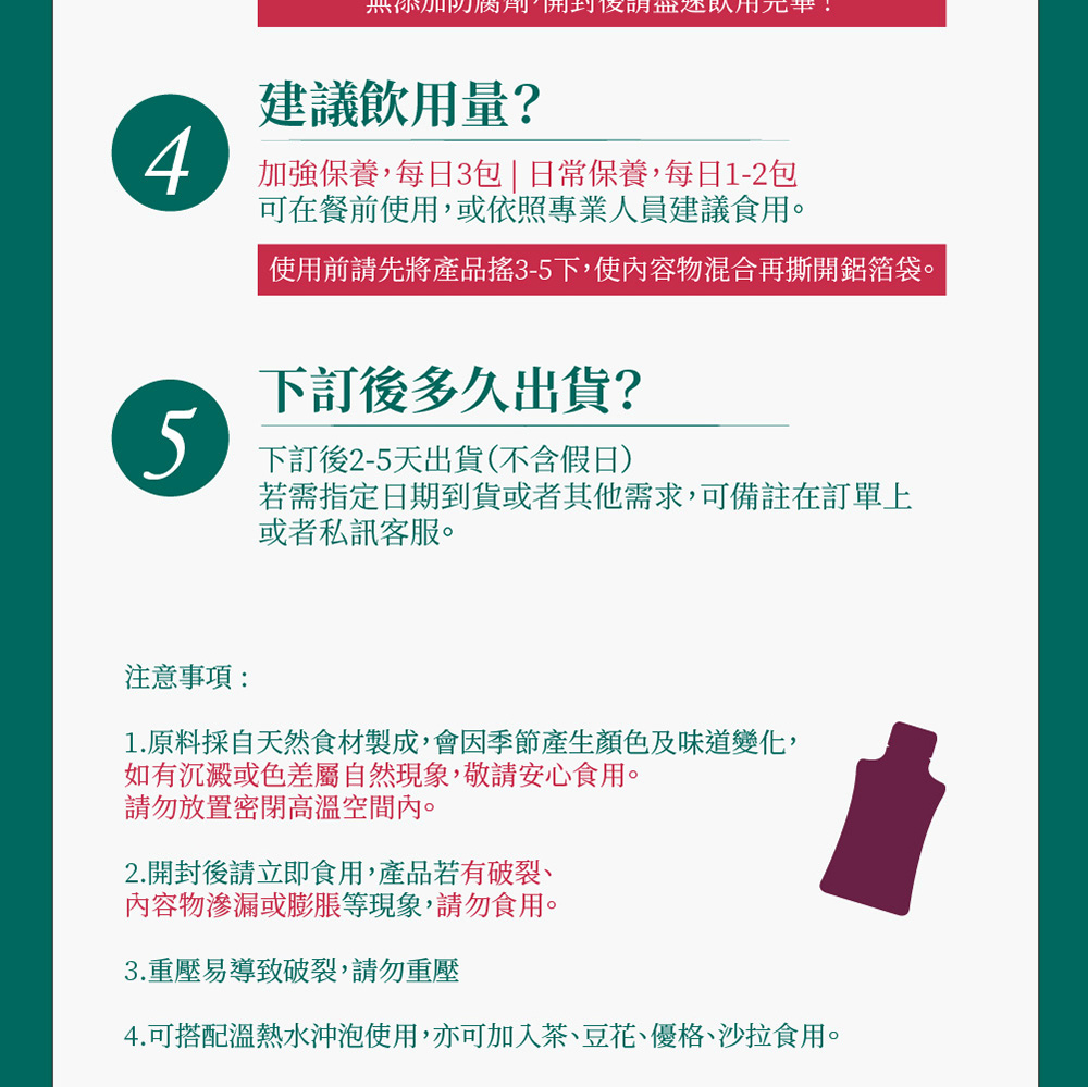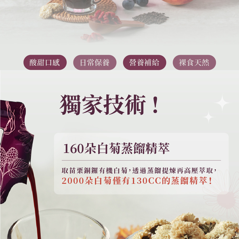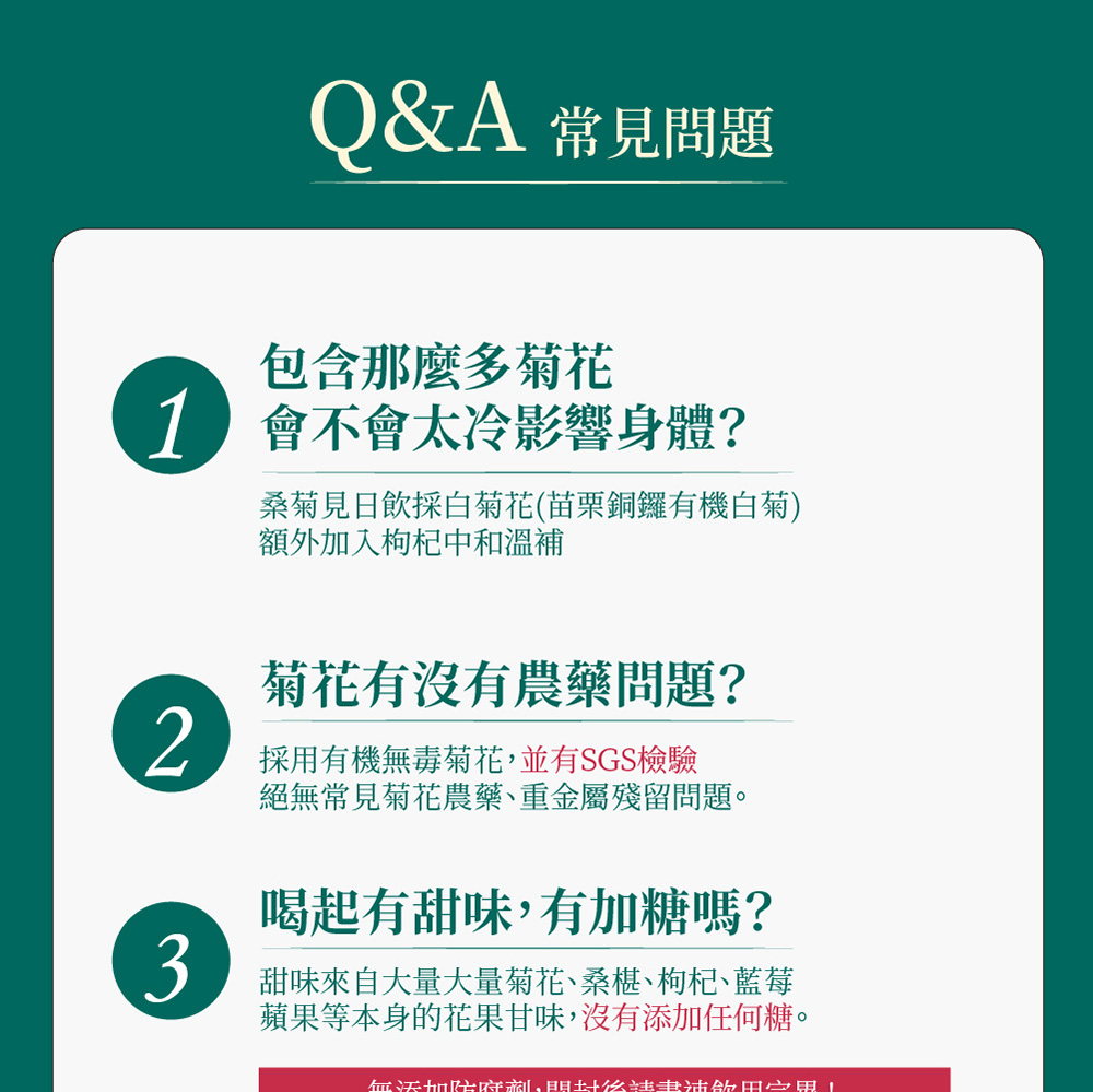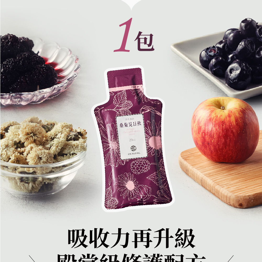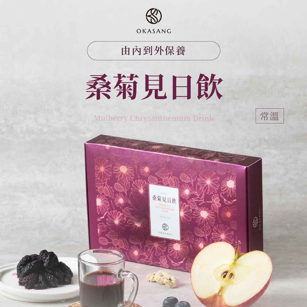 🎖葉黃素≠花青素,花青素更能幫助葉黃素吸收🎖3C低頭族群,補充花青素必備聖品🎖一日三包,三日加強保養🎖100%純天然食材,0食品添加🎖非凡大探索專題推薦❓常見Q&A❓Q1.包含那麼多菊花,會不會太冷影響身體?A1.桑菊見日飲採白菊花(苗栗銅鑼有機白菊)額外加入枸杞中和溫補Q2.菊花有沒有農藥問題?A2.採用有機無毒菊花,並有SGS檢驗,絕無常見菊花農藥、重金屬殘留問題。Q3.喝起來有甜味,有加糖嗎?A3.甜味來自大量菊花、桑葚、枸杞、藍莓、蘋果等本身花果甘味,沒有額外添加任何糖*無添加防腐劑,開封後請盡速飲用完畢!Q4.建議飲用量?A4.加強保養每日3包、日常保養每日1-2包,可在餐前使用,或依照專業人員建議食用❗注意事項:1.原料採自天然食材製成,會因季節產生顏色及味道變化,如有沉澱或色差屬自然現象,敬請安心食用。請勿放置密閉高溫空間內。2.開封後請立即食用,產品若有破裂、內容物滲漏、膨脹等現象,請勿食用並連繫客服3.重壓易導致破裂,請勿重壓4.可搭配溫熱水沖泡使用,亦可加入茶、豆花、優格、沙拉使用☎️客服專線:0800-001-394🗒️LINE:@okasang🤵♀️客服服務時間:一、二 8:30-17:00三、四 、五 8:30-21:00六、日 10:00-21:00
