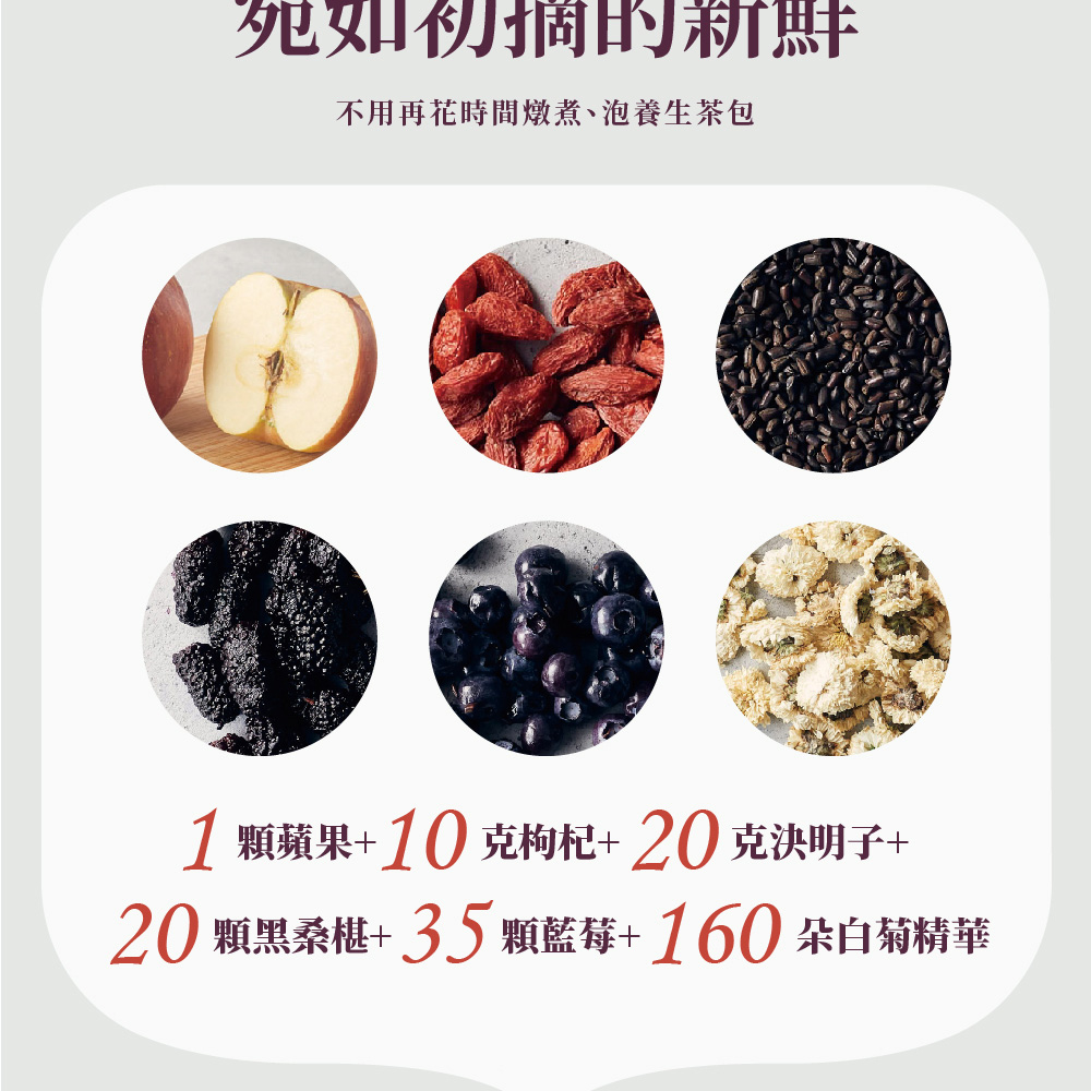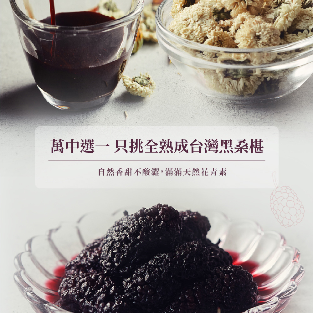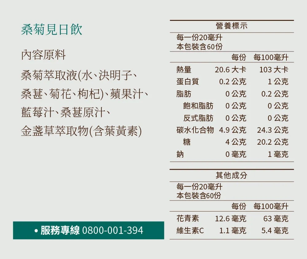 桑菊萃取液(水、決明子、桑葚、菊花、枸杞)、蘋果汁、藍莓汁、桑葚原汁、金盞草萃取物(含葉黃素)