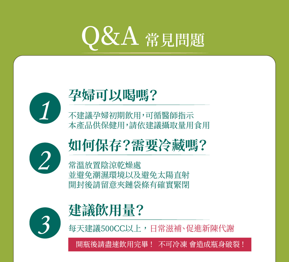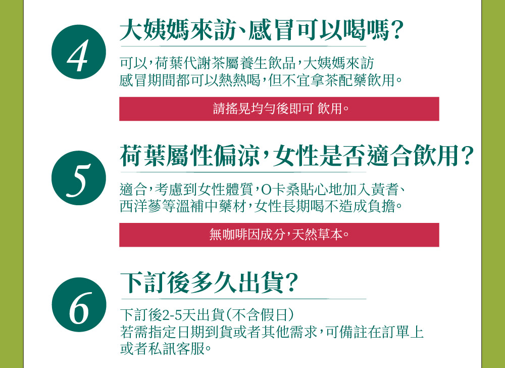 促進新陳代謝,維持健康使排便順暢,維持消化道機能無糖去油解膩0負擔中藥材磨碎更好沖泡一包可沖泡到1000cc❓常見Q&A❓Q1.孕婦可以喝嗎?A1.不建議孕期初期飲用,可循醫師指示,本產品供保健用,請依建議攝取量食用Q2.建議飲用量?A2.每天建議500c.c.以上,日常滋補,促進新陳代謝!Q3.大姨媽來訪、感冒可以喝嗎?A3.可以,荷葉代謝茶屬養生飲品,大姨媽來訪、感冒期間可以熱熱喝,但不宜拿茶配藥飲用Q4.荷葉屬性偏涼,女性是否適合飲用?A4.適合,考慮到女性體質,O卡桑貼心的加入黃耆、西洋蔘等溫補中藥材,女性長期喝不造成負擔,無咖啡因成分,天然草本!Q5.如何保存?A5.常溫放置陰涼乾燥處,並避免潮濕環境以及避免太陽直射,開封後請留意夾鏈袋條有確實緊閉。*產品若有剛開封即變質情形請立即聯絡客服回收及後續服務☎️客服專線:0800-001-394🗒️LINE:@okasang🤵♀️客服服務時間:一、二 8:30-17:00三、四 、五 8:30-21:00六、日 10:00-21:00