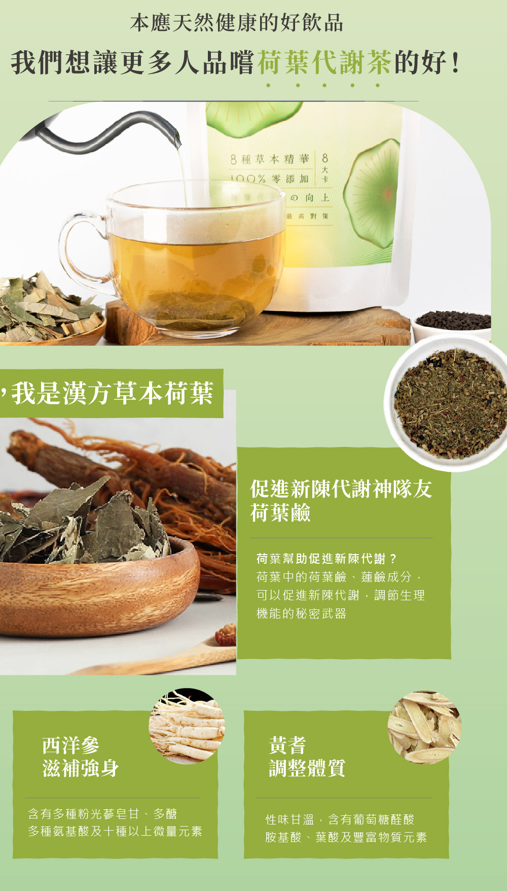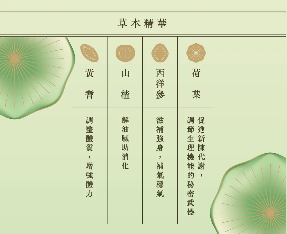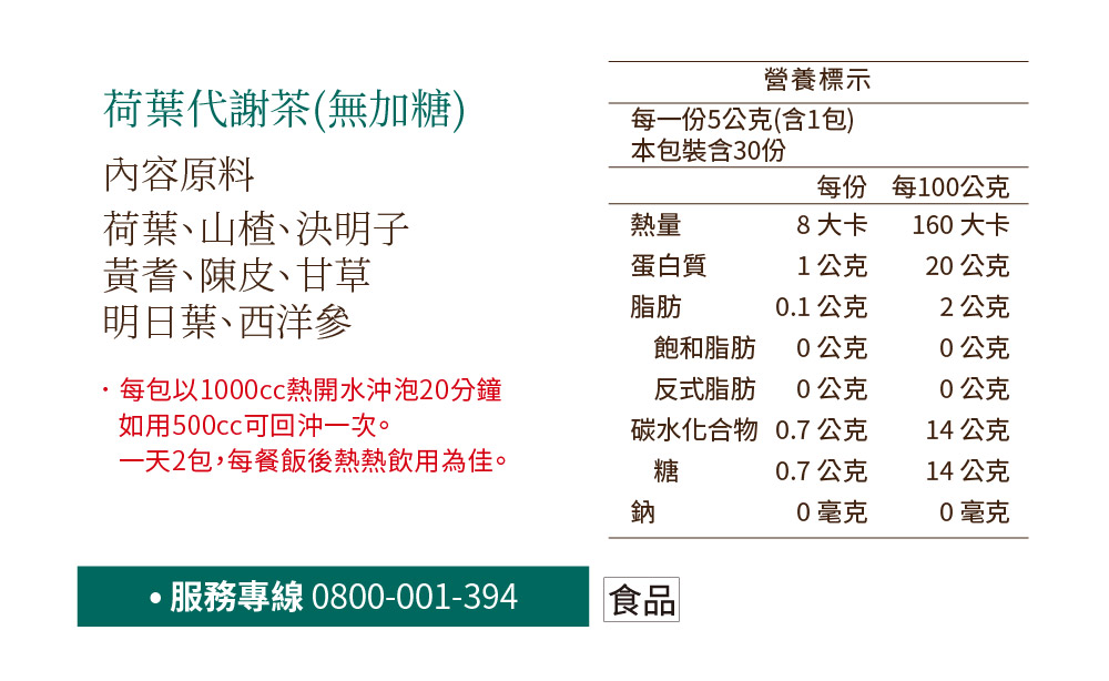 荷葉、山楂、決明子、黃耆、陳皮、甘草、明日葉、西洋蔘 *每包以1000c.c.熱開水沖泡20分鐘,如用500c.c.容器可回沖一次 一天2包每餐飯後熱熱飲用為佳
